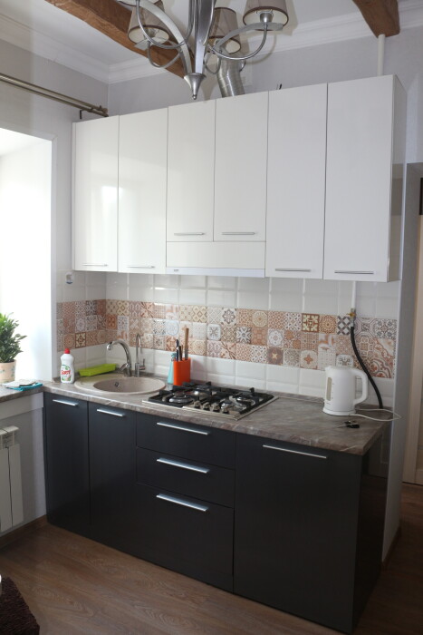 Квартира с отдельной кухней, в которой есть все необходимое для комфортного проживания: плита, микроволновка, электрический чайник, холодильник с морозильником и хороший набор посуды, а так же кухонных принадлежностей.