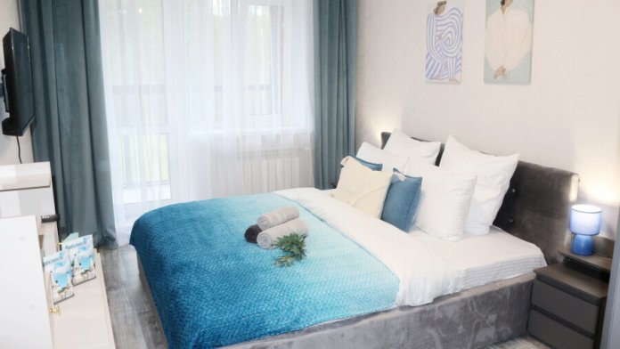 Квартира рассчитана на 6 гостей: Особо-широкая кровать «King-Size», с качественным ортопедическим матрасом для идеального сна. И 2 дивана-кровати, каждый на 2 человек. Постельное белье - красивый полосатый страйп-сатин.