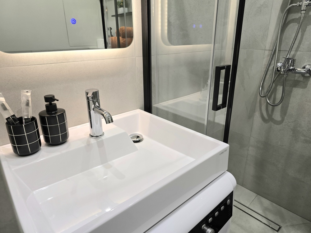 - Просторная спальная зона: Удобная кровать с ортопедическим матрасом 140×200 и стильный компактный диван для третьего гостя.