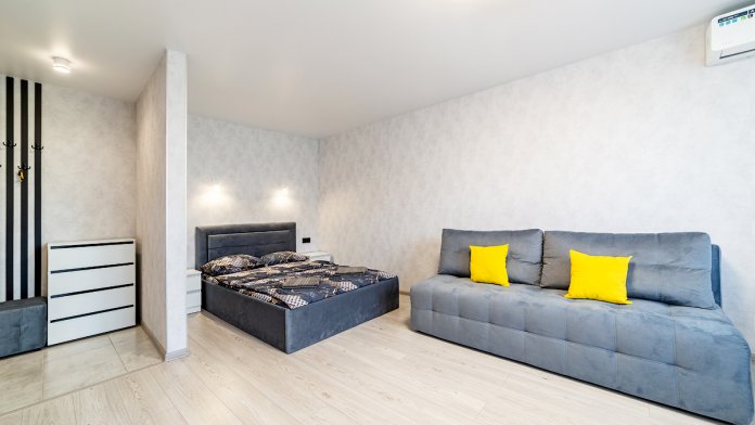 Комфортное размещение до 4 человек (2+2): двуспальная кровать, раскладной диван.