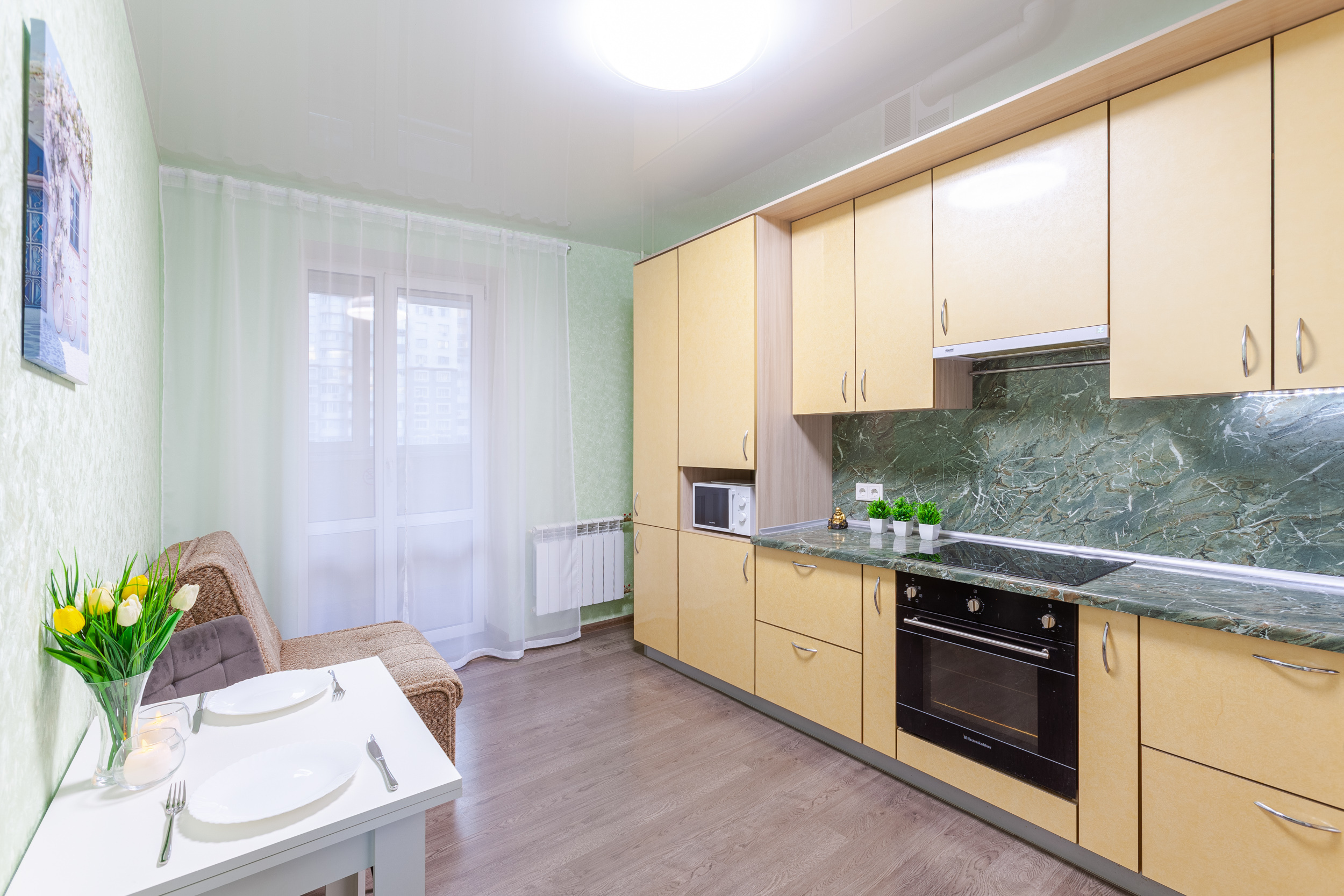 - оснащённая кухня, посуда;