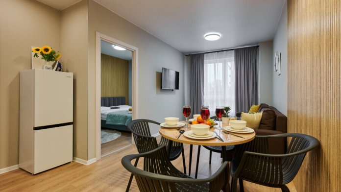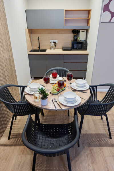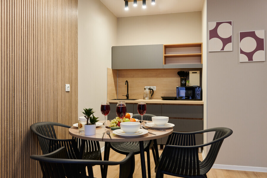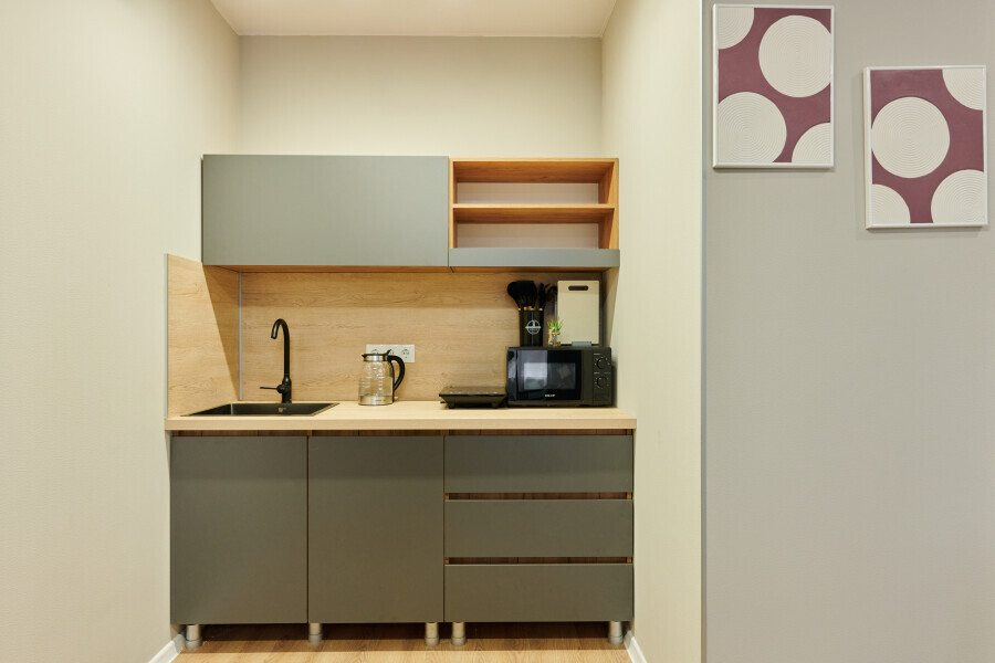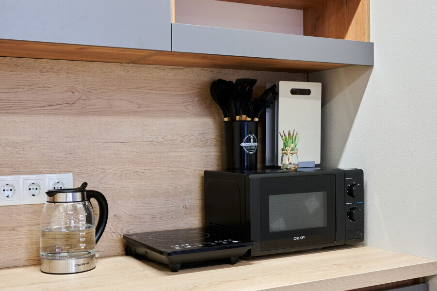 - Кухня с холодильником, плитой, микроволновкой, чайником и посудой