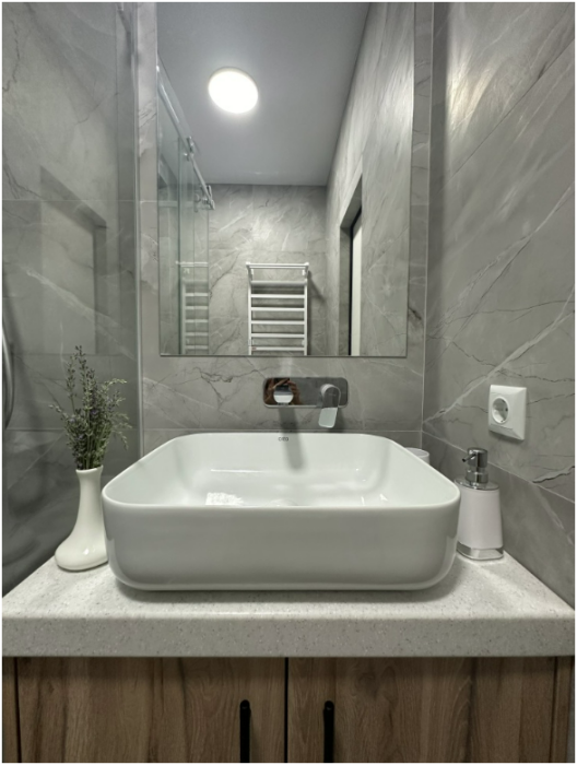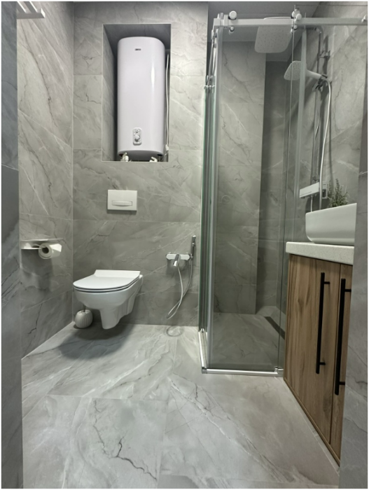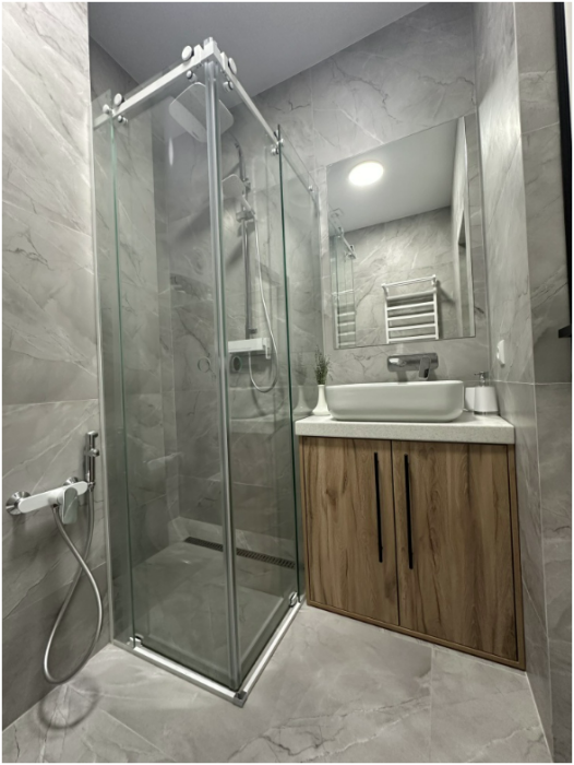 Апартамент состоит из спальни с двуспальной кроватью с ортопедическим матрацем , кухонной зоны, санузла. Общая площадь апартамента 28 кв.м.