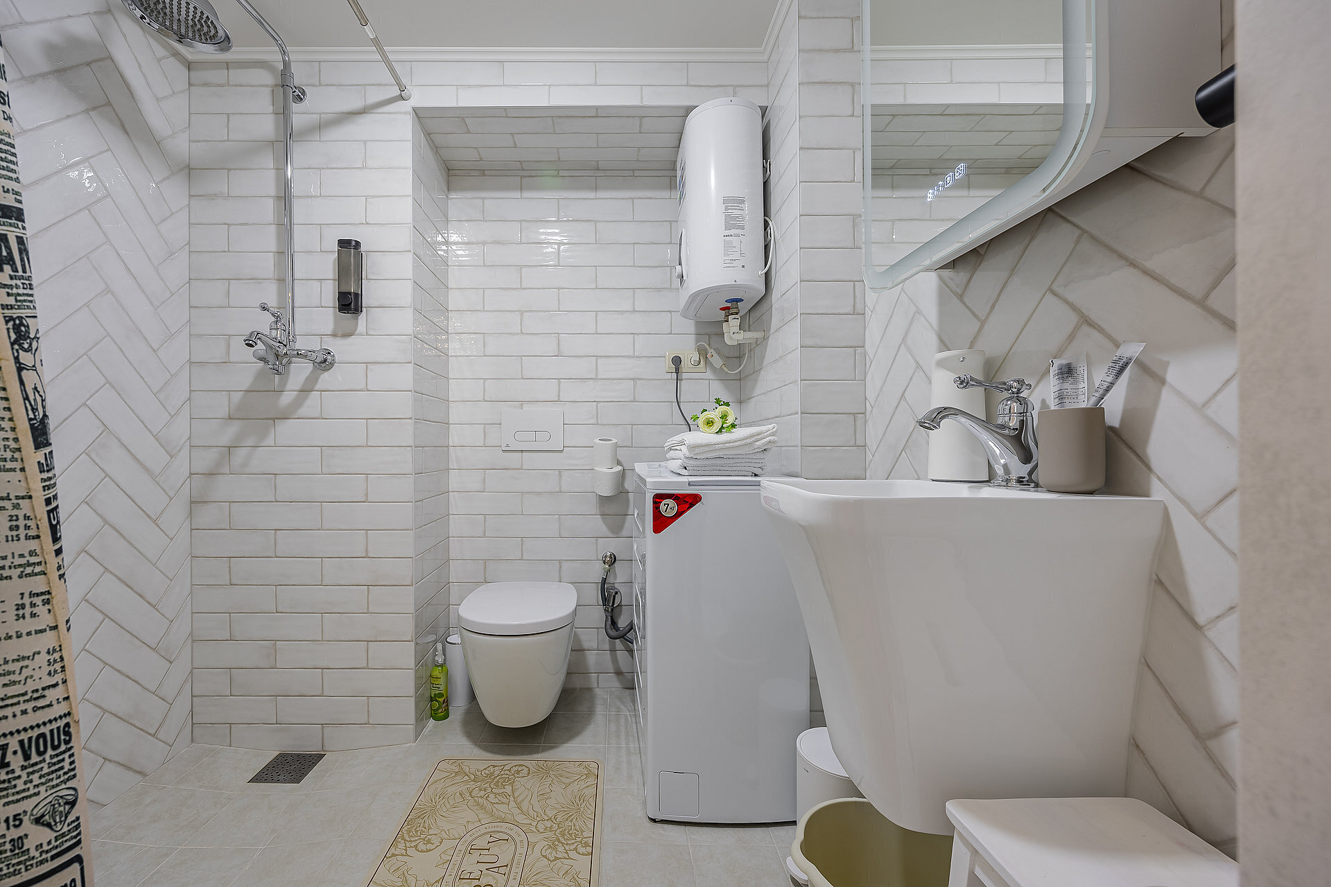 Всё нужное для проживания: кофе, чай, посуда, утюг, стиральная машина, сушилка, гладильная доска.