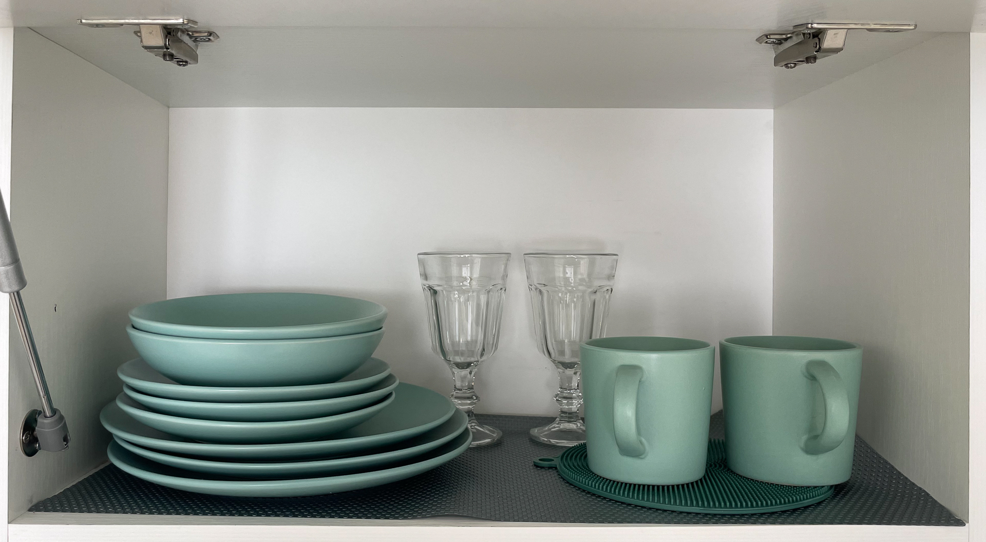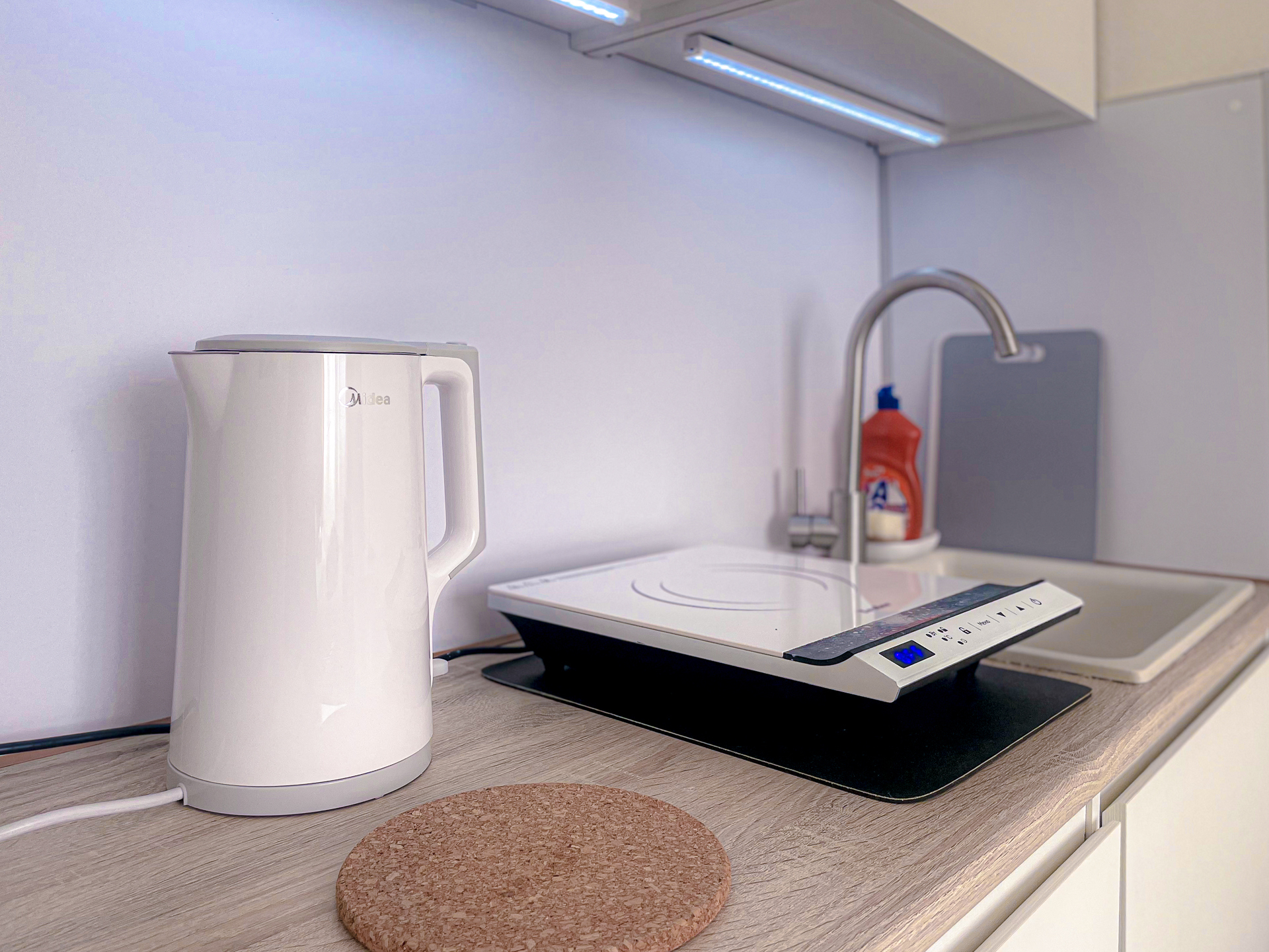 Кухня: холодильник, свч, плита, чайник и посуда для приготовления и приема пищи.
