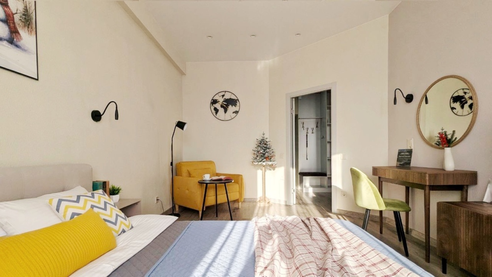 Современная, просторная однокомнатная квартира, рядом с железнодорожным вокзалом, и новым сквером. До источника 10-15 минут пешком.