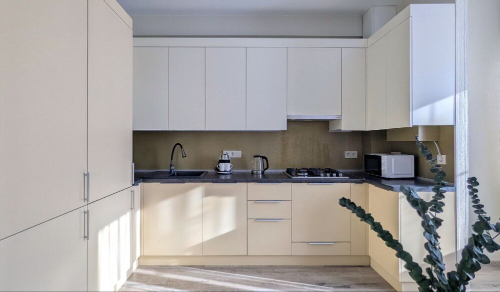 Кухня оснащена всем необходимым: холодильник, газовая варочная поверхность, посудомоечная машина, электрический чайник, кофеварка, микроволновая печь. Кастрюли, сковородки, приборы, посуда.