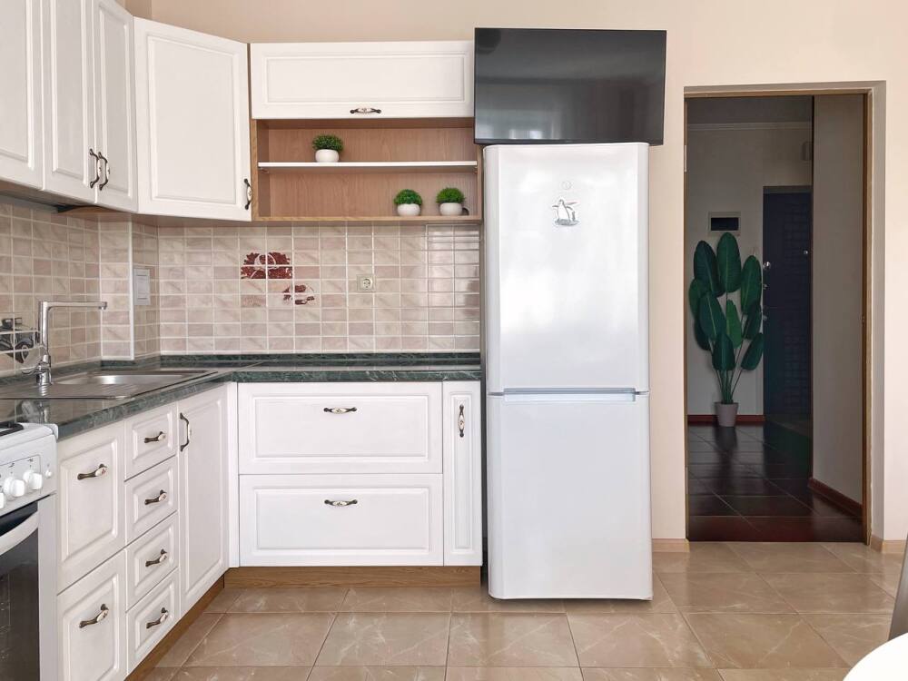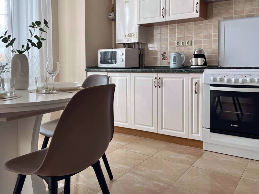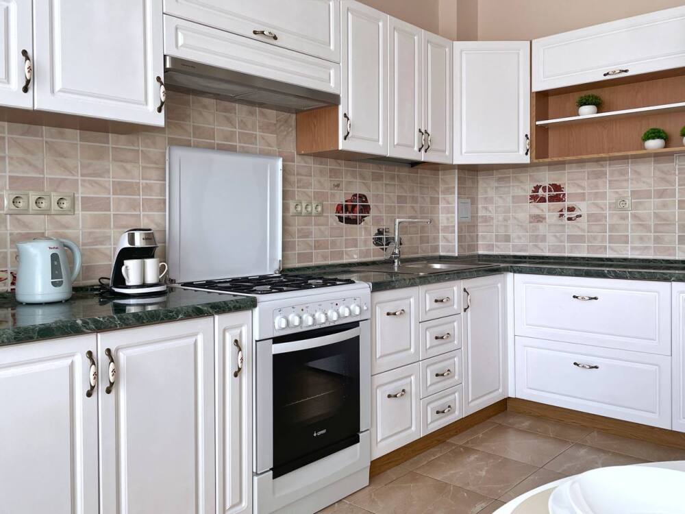 Кухня оснащена всем необходимым: холодильник, газовая печь с духовкой, кофеварка, электрический чайник, микроволновая печь. Кастрюли, сковородки, приборы, посуда.