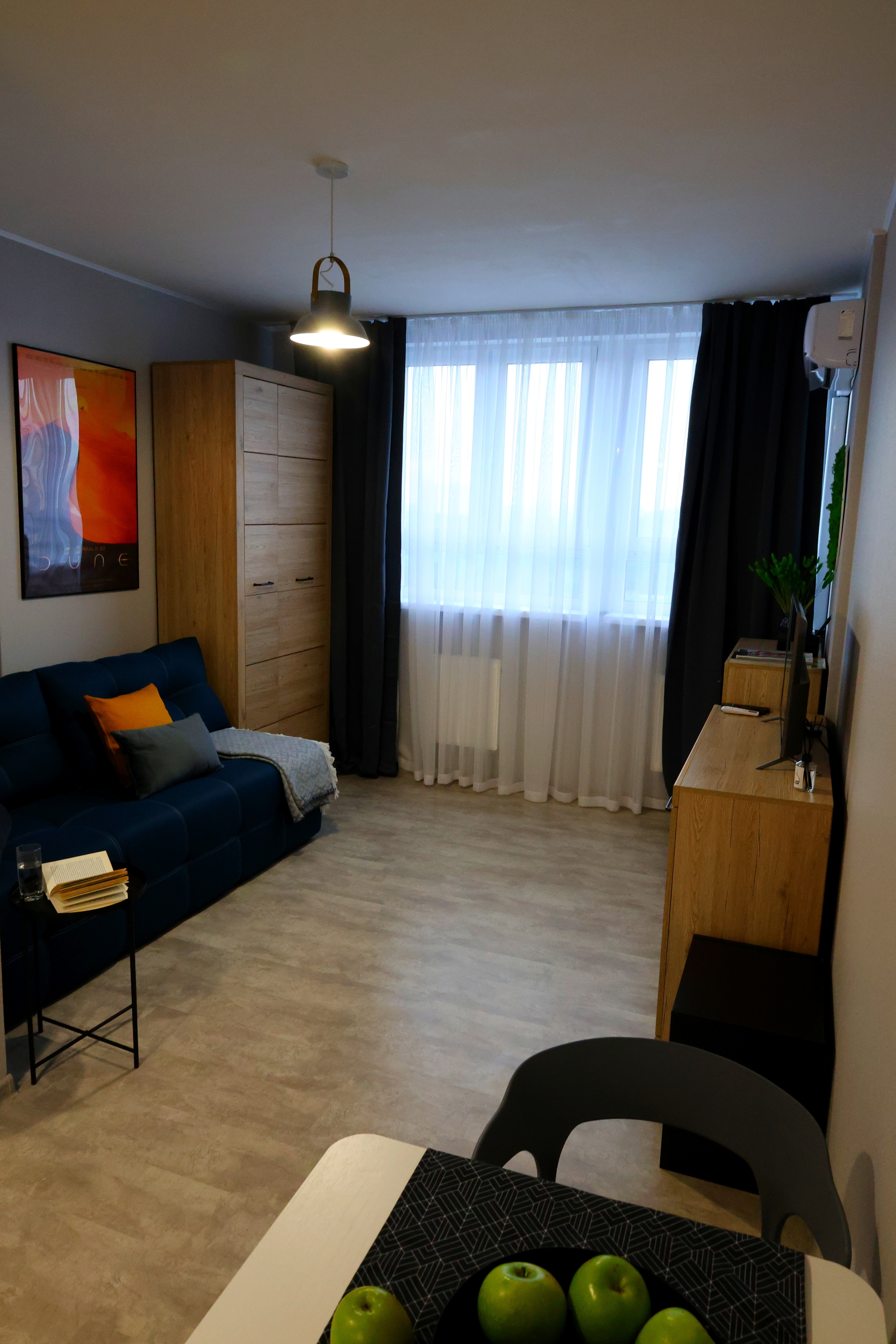 Уютная студия в современном жилом комплексе. В квартире есть кондиционер, а само пространство продумано так, чтобы было удобно разместиться троим гостям. Отличный выбор для короткой остановки в городе.