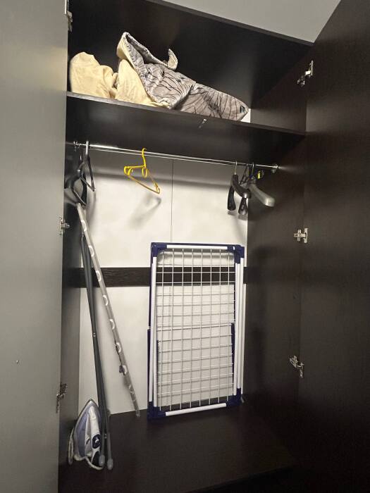 Стиральная машина, фен, утюг, гладильная доска, сушилка для одежды.
