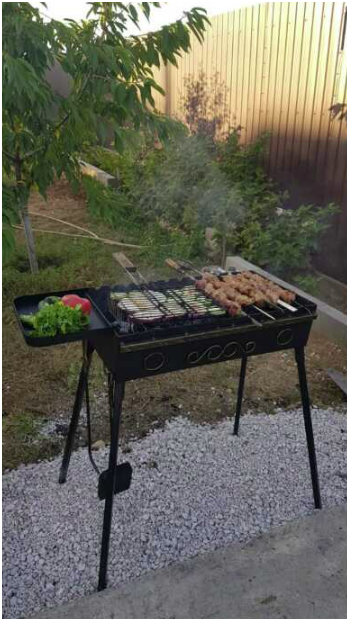 Во дворе мангальная зона, огороженный двор, смотровая крыша со столиками.