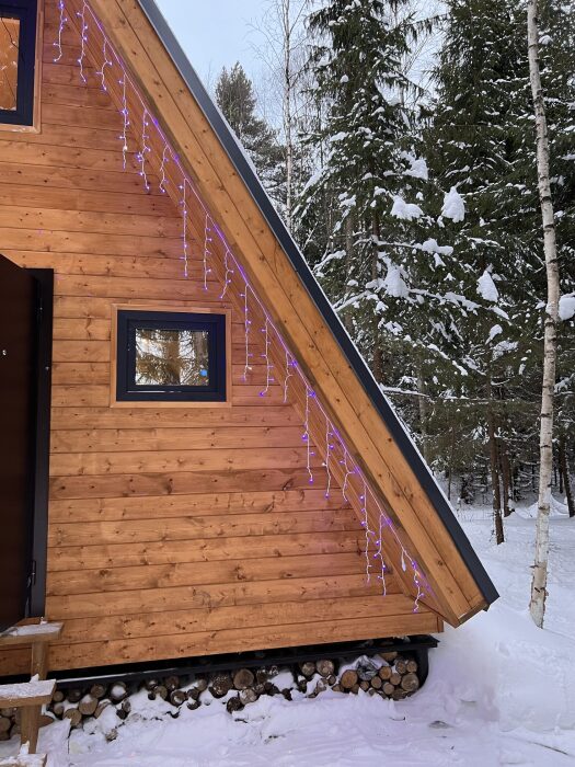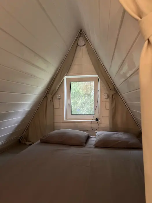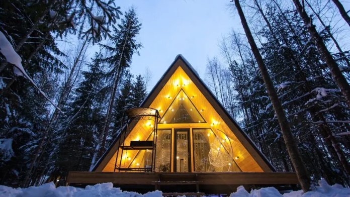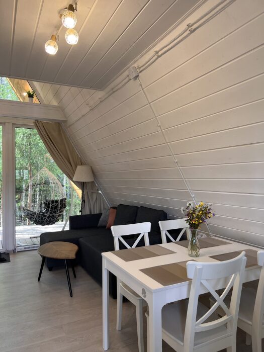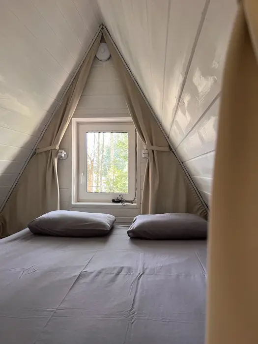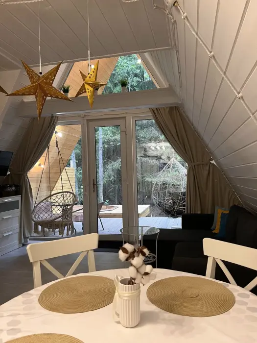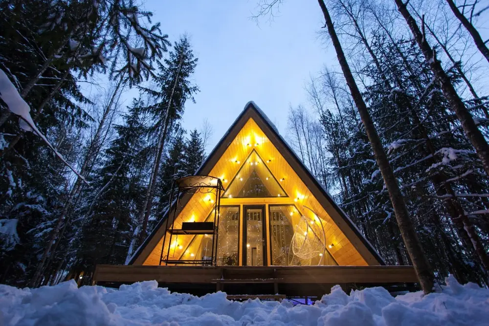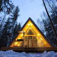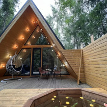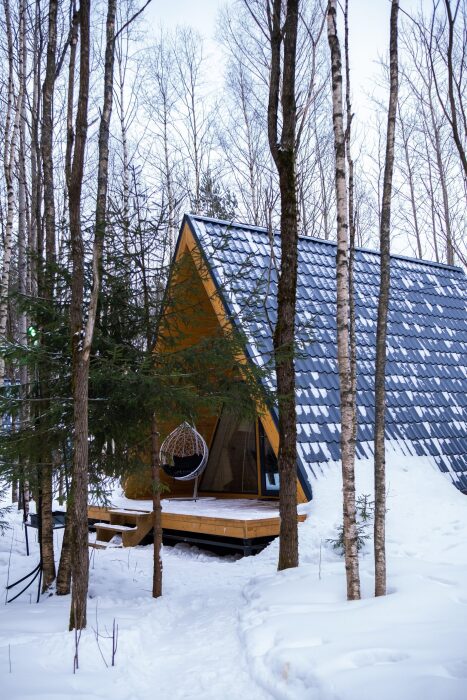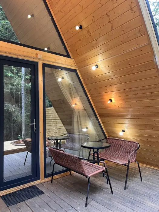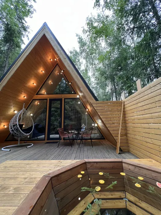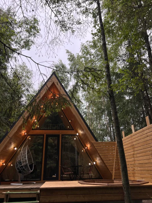 8 домиков A-frame, каждый из которых рассчитан на проживание 2-4 человек, имеют свою террасу с мангалом и зоной отдыха. Панорамные окна дома выходят на лес.