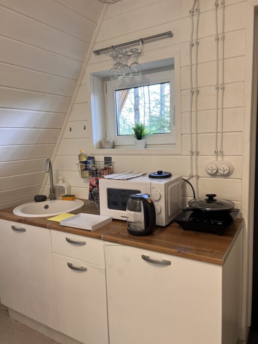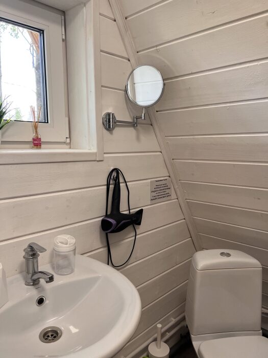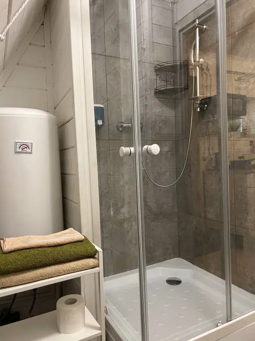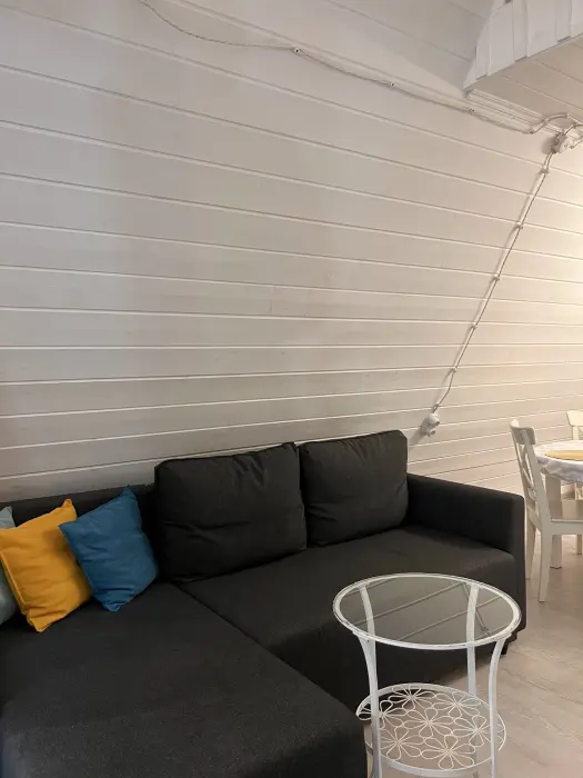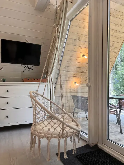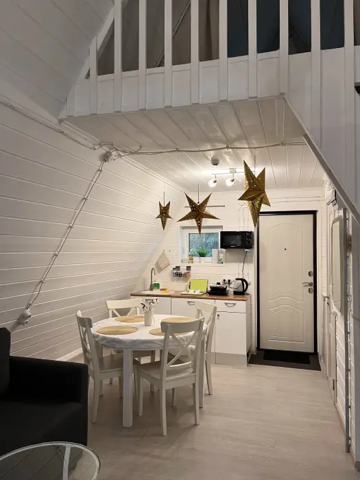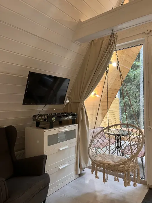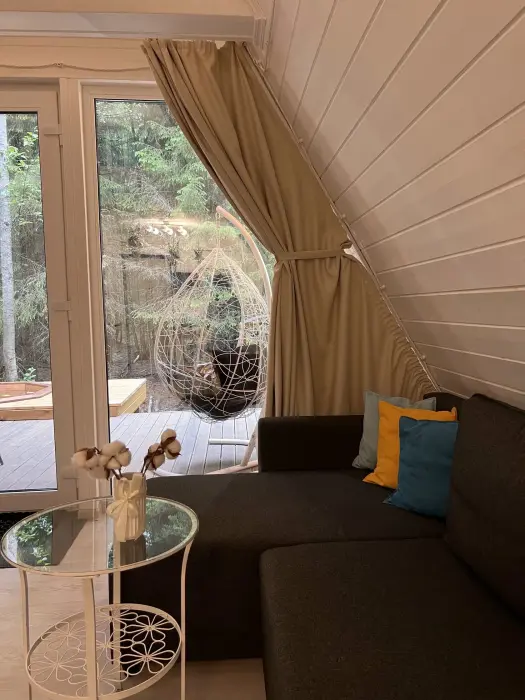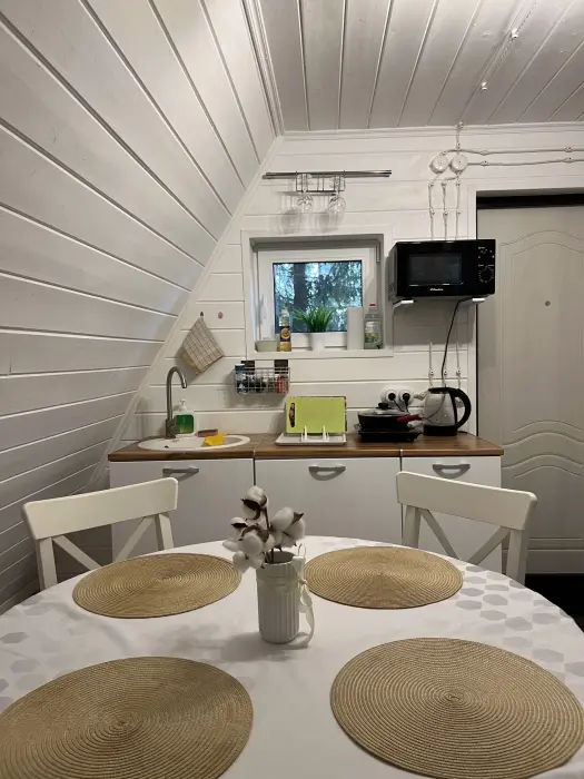 Из удобств в каждом домике: мини-кухня со всем необходимым (микроволновка, холодильник, варочная панель, чайник, посуда); обеденная зона на 4 персоны; санузел с душем (полотенца и гель для душа, фен); бесплатный Wi-Fi, ТВ; конвекторное отопление; двуспальное место под крышей и двуспальный диван внизу; ортопедические удобные матрасы, хлопковое постельное белье; настольный футбол, игры, дартс, бадминтон; природа, озеро с пляжем в 5 минутах ходьбы; собственная терраса с качелью, мангал (решетки и шампуры предоставляем).