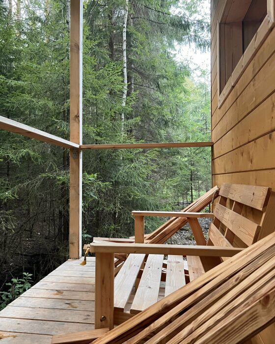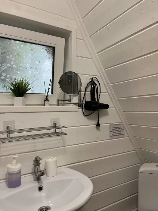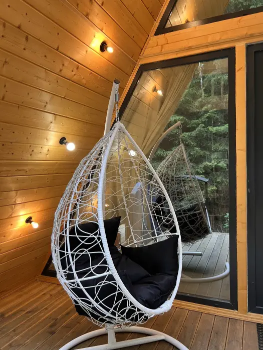 Из удобств в каждом домике: мини-кухня со всем необходимым (микроволновка, холодильник, варочная панель, посуда); бесплатный Wi-Fi; конвекторное отопление; ортопедические удобные матрасы, хлопковое постельное белье; санузел с душем, полотенца, средства гигиены; природа, озеро в 7 минутах ходьбы; собственная терраса с качелью и купелью Фурако, мангал. В стоимость проживания входит 1 растопка купели Фурако.