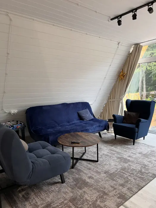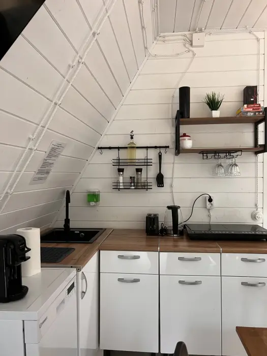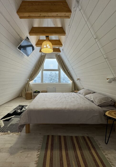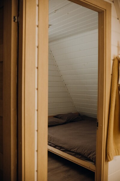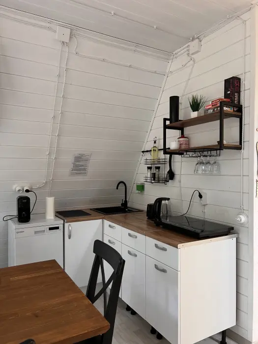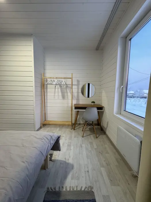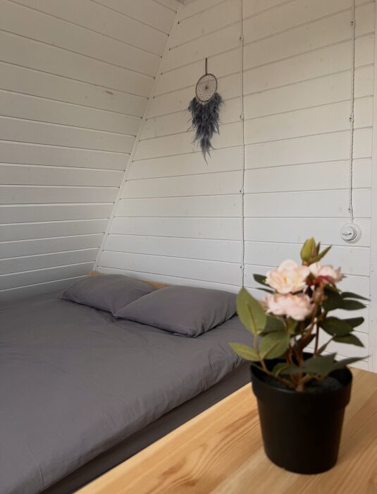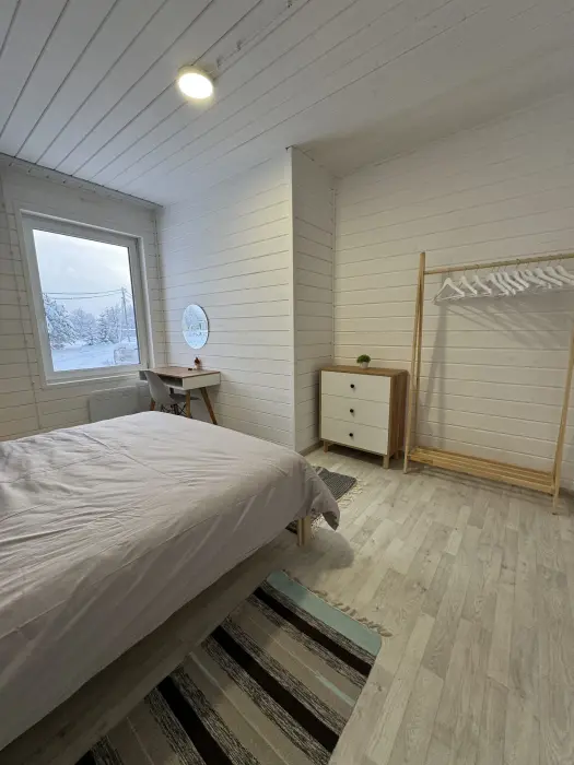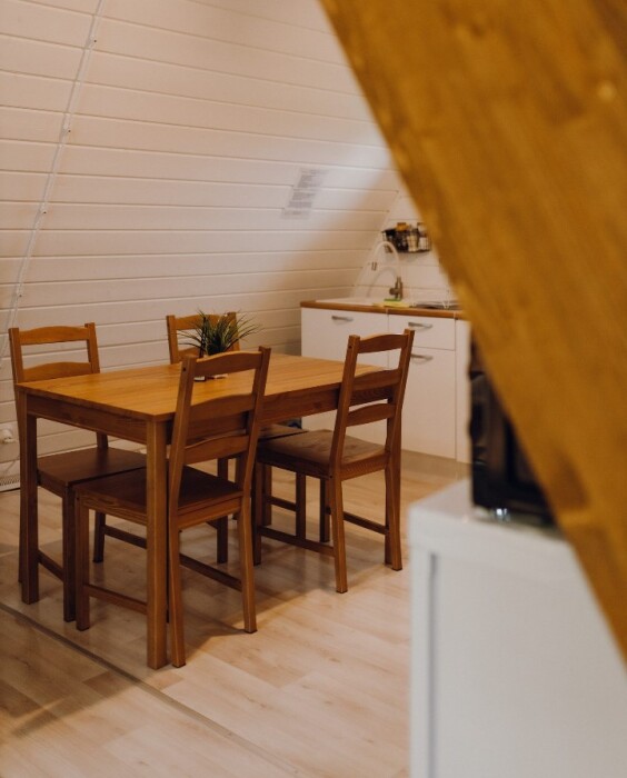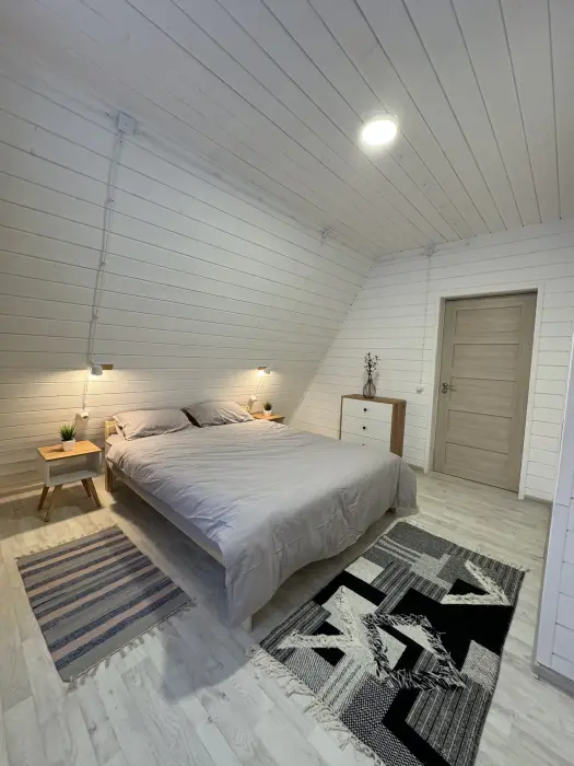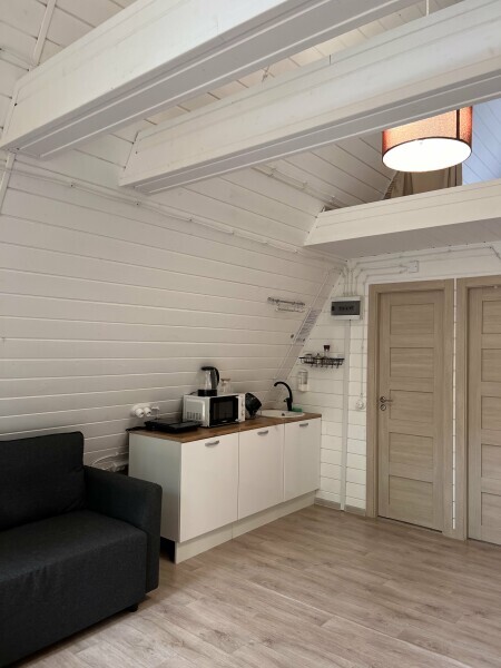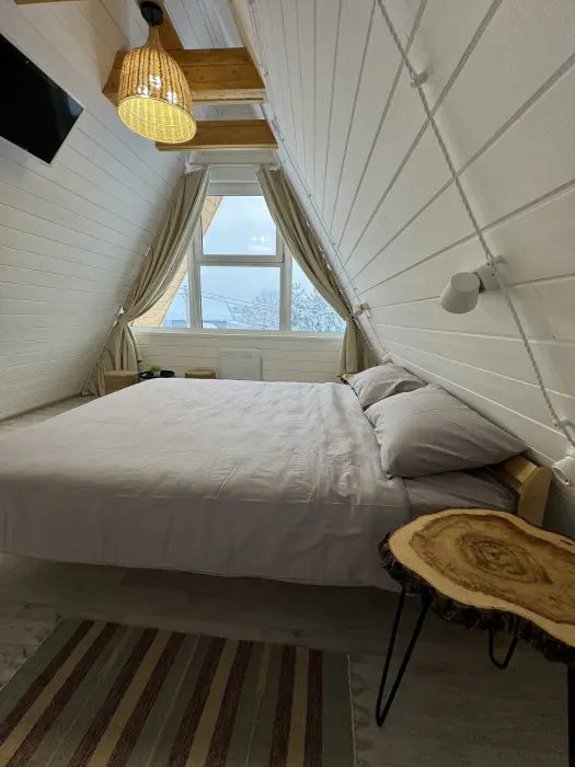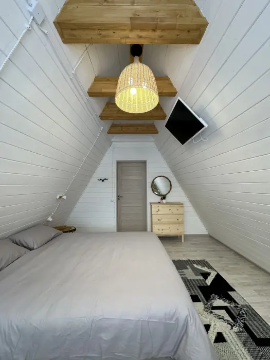 Из удобств в каждом домике: мини-кухня со всем необходимым (микроволновка, холодильник, варочная панель, посуда, чайник); санузел с душем (полотенца, средства гигиены, фен); отдельная спальня на 1м этаже, двуспальный матрас под крышей и двуспальный диван внизу; бесплатный Wi-Fi, телевизор; отопление; ортопедические удобные матрасы, хлопковое постельное белье; собственная терраса с качелью, мангал.