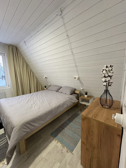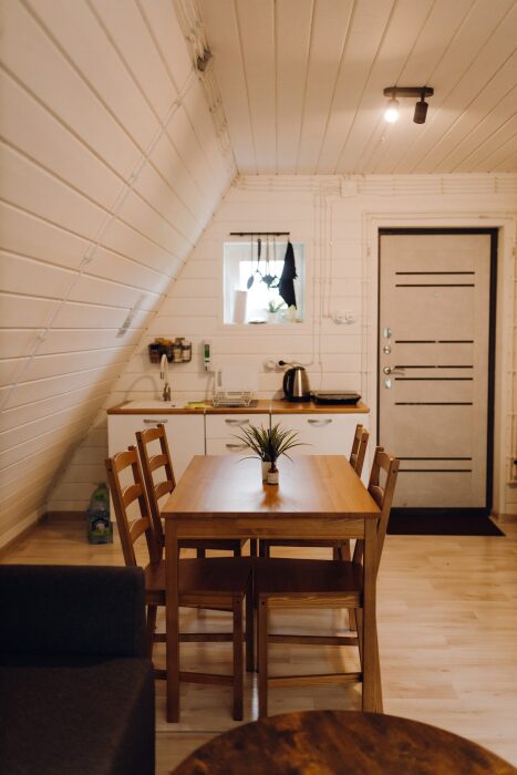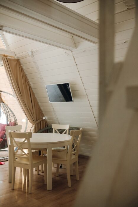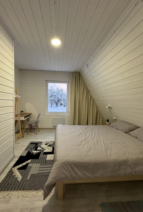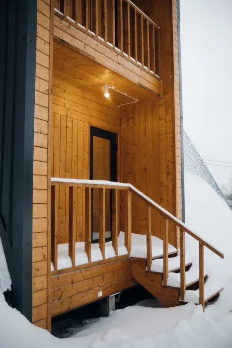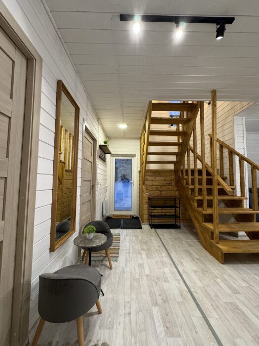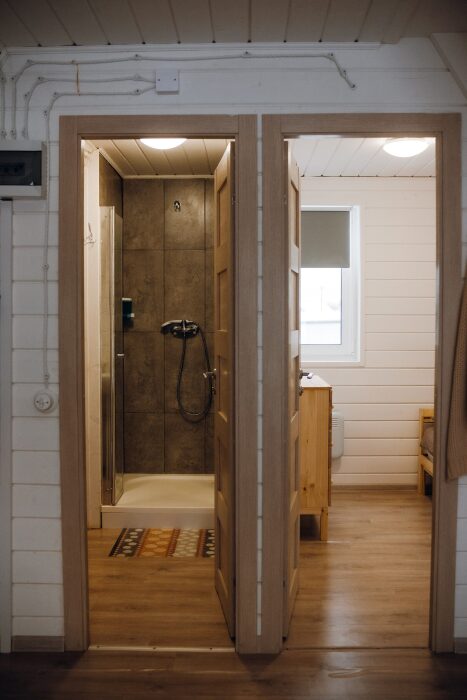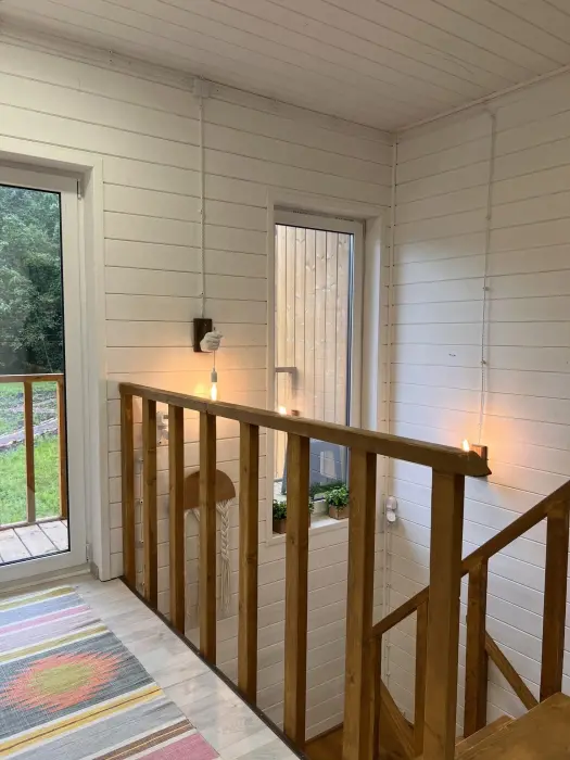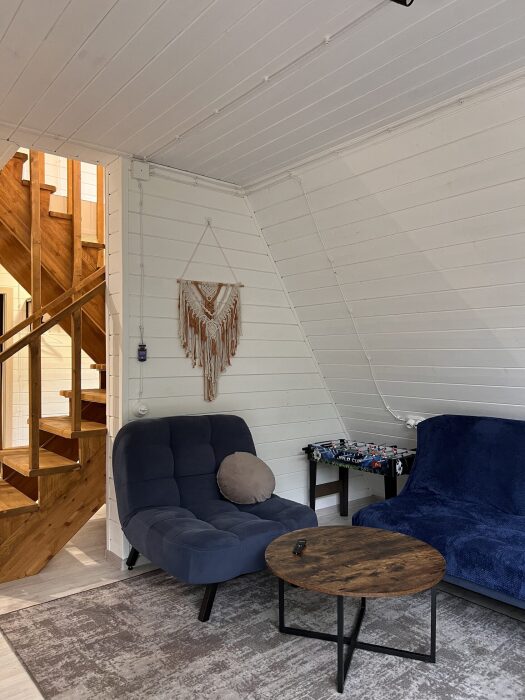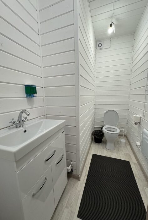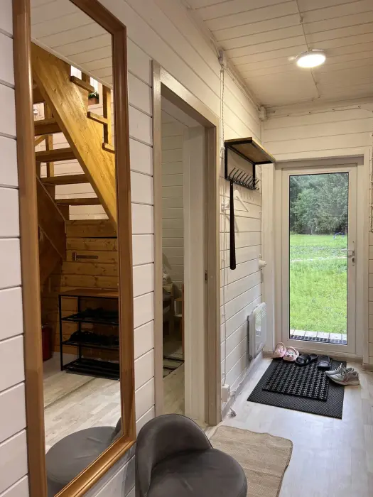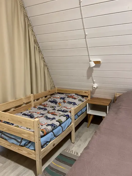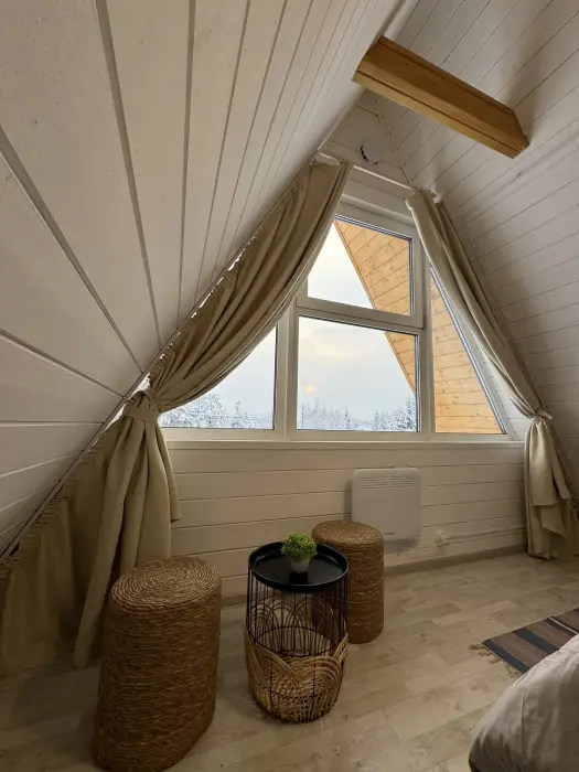 Из удобств в каждом домике: мини-кухня со всем необходимым (микроволновка, холодильник, варочная панель, посуда, чайник); санузел с душем (полотенца, средства гигиены, фен); отдельная спальня на 1м этаже, двуспальный матрас под крышей и двуспальный диван внизу; бесплатный Wi-Fi, телевизор; отопление; ортопедические удобные матрасы, хлопковое постельное белье; собственная терраса с качелью, мангал.