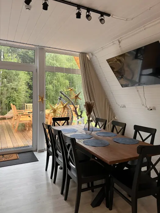 Из удобств в каждом домике: мини-кухня со всем необходимым (микроволновка, холодильник, варочная панель, посуда, чайник); санузел с душем (полотенца, мыло и гель для душа, фен); бесплатный Wi-Fi, телевизор; отопление; двуспальный диван на 1 этаже и двуспальный матрас под крышей, ортопедические удобные матрасы, хлопковое постельное белье; собственная терраса с качелью, мангал.