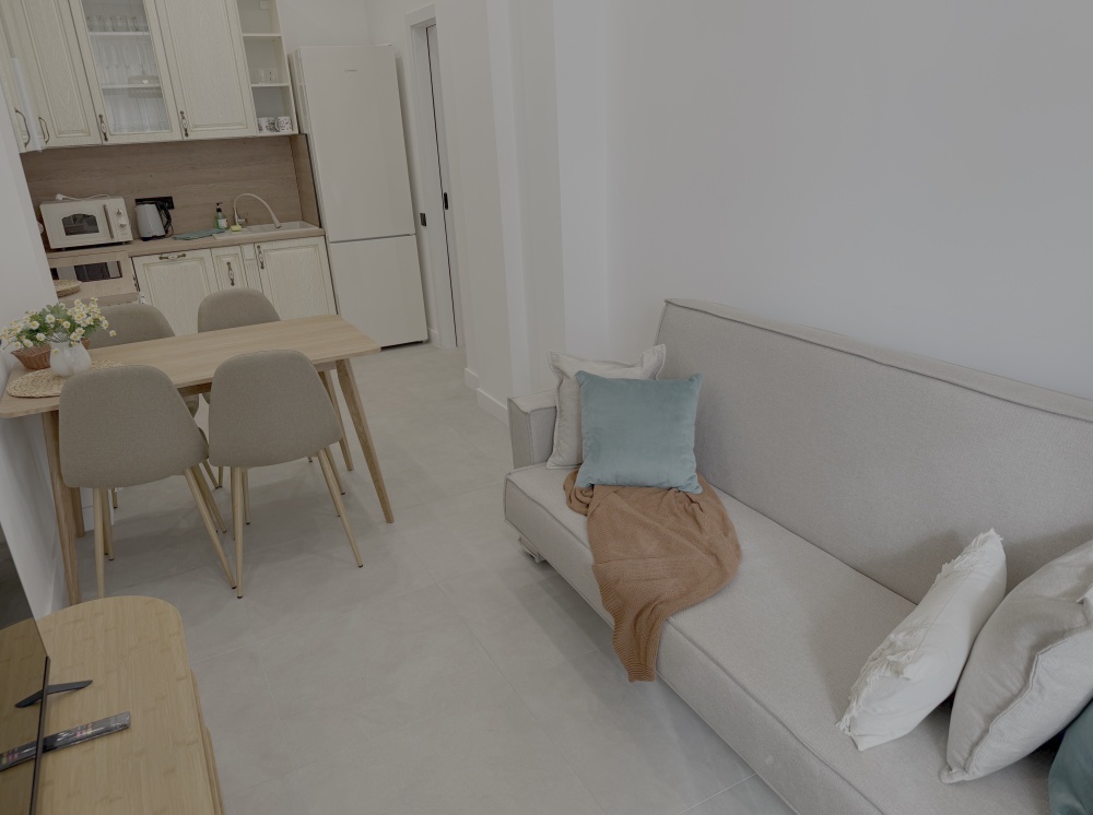 Третья комната сочетает функциональность кухни и гостиной зоны. Здесь установлена стильная встраиваемая техника (электрическая варочная панель с духовкой, посудомоечная машина), микроволновая печь, электрочайник и вместительный двухкамерный холодильник. Уголок с мягким диваном приглашает расслабиться после насыщенного дня, а изящный обеденный стол с удобными стульями позволит насладиться семейным ужином.