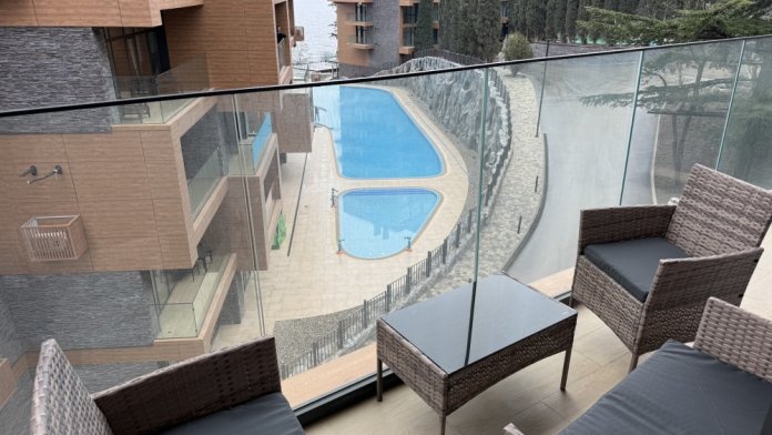 Панорамный балкон открывает потрясающие виды на Чёрное море и благоустроенную территорию с бассейном с подогревом воды, позволяя наслаждаться отдыхом круглый год.