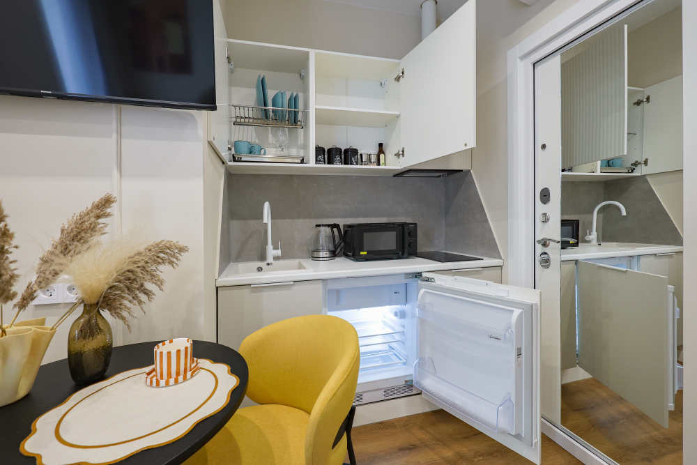 - плита, вытяжка, микроволновая печь, холодильник, чайник;