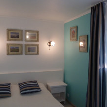 Рядом с ним, в тени грецкого ореха, есть столик, а напротив входа – пруд и чайная беседка. Комнаты в домике смежные и меблированы шкафом, тумбочками, ротанговыми комодом, креслами и столиком, 2-х спальной кроватью в одной комнате и двухъярусной кроватью в другой. В прихожей имеется шкафчик для обуви и вешалка для верхней одежды.