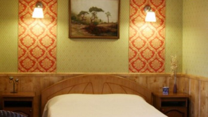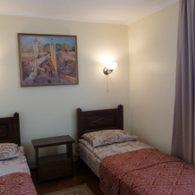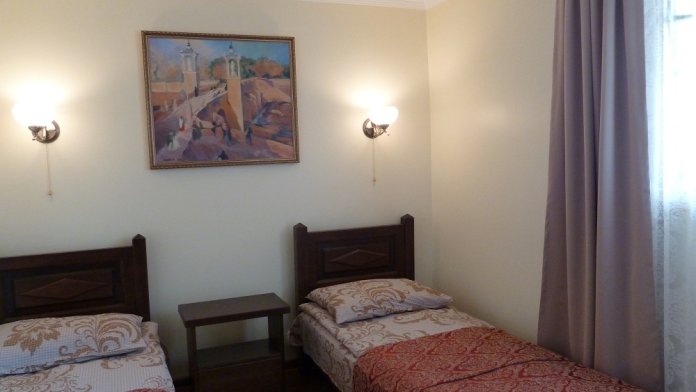 Номер меблирован стенным шкафом, зеркалом, комодом, тумбочкой, банкеткой, двумя односпальными кроватями, которые можно сдвинуть вместе.