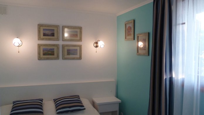 Крымская комната оборудована вытяжным вентилятором,, DVD Номер меблирован стенным шкафом, тумбочкой, зеркалом, двумя односпальными кроватями, которые можно сдвинуть вместе.