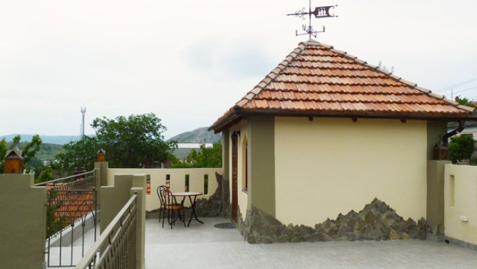 Оборудована терраса с шезлонгами. С нее открывается изумительный вид на Крымские горы.