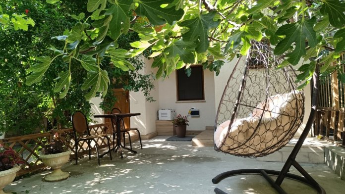 Домик имеет свой собственный навес, стоит столик и стулья.