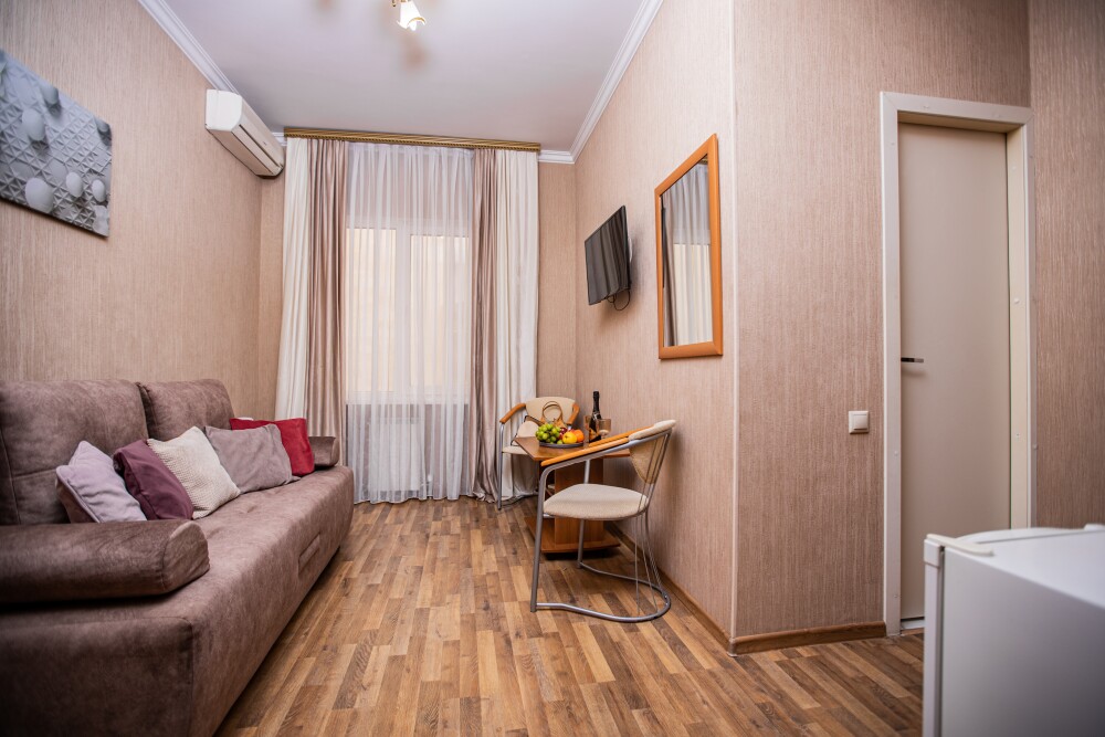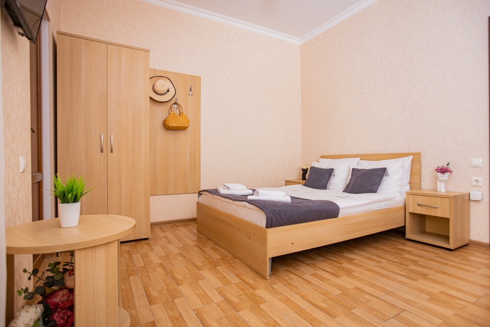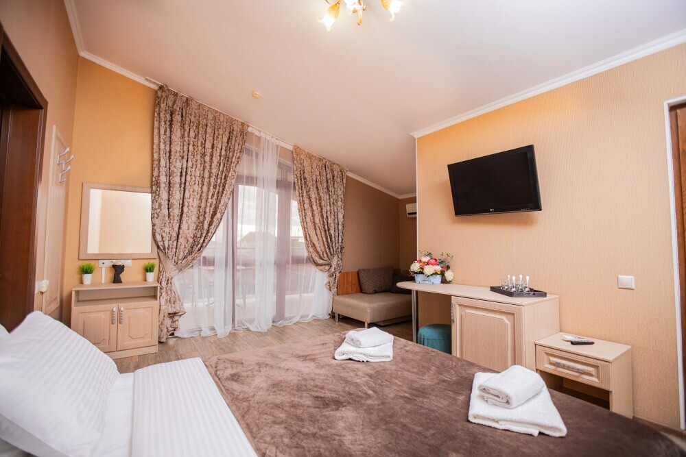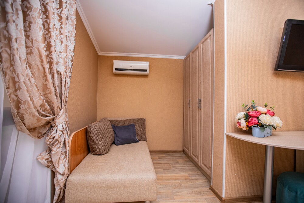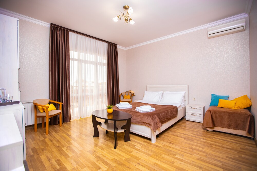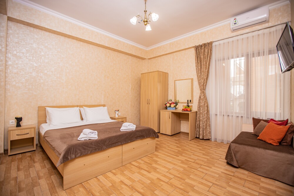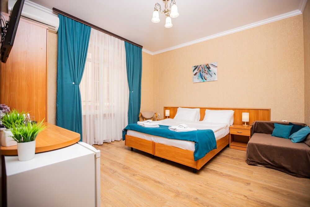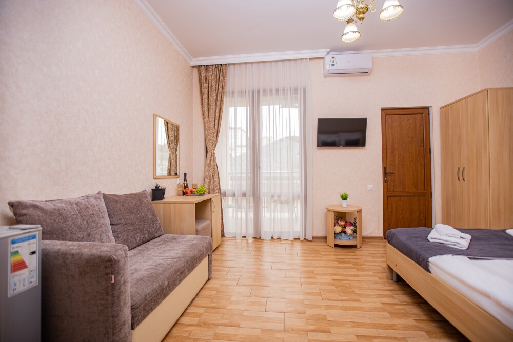 Номер площадью 20м2 - создан для комфортного размещения компании или семьи. В нём гармонично сочетаются двуспальная кровать для полноценного отдыха, удобный диван для дневных посиделок и мягкая софа - дополнительное спальное место. Кондиционер обеспечит приятную прохладу, телевизор подарит часы развлечений, а собственный балкон станет любимым местом для утреннего кофе или вечерних созерцаний. Всё необходимое, включая фен, уже подготовлено - Вам остаётся только наслаждаться отдыхом.