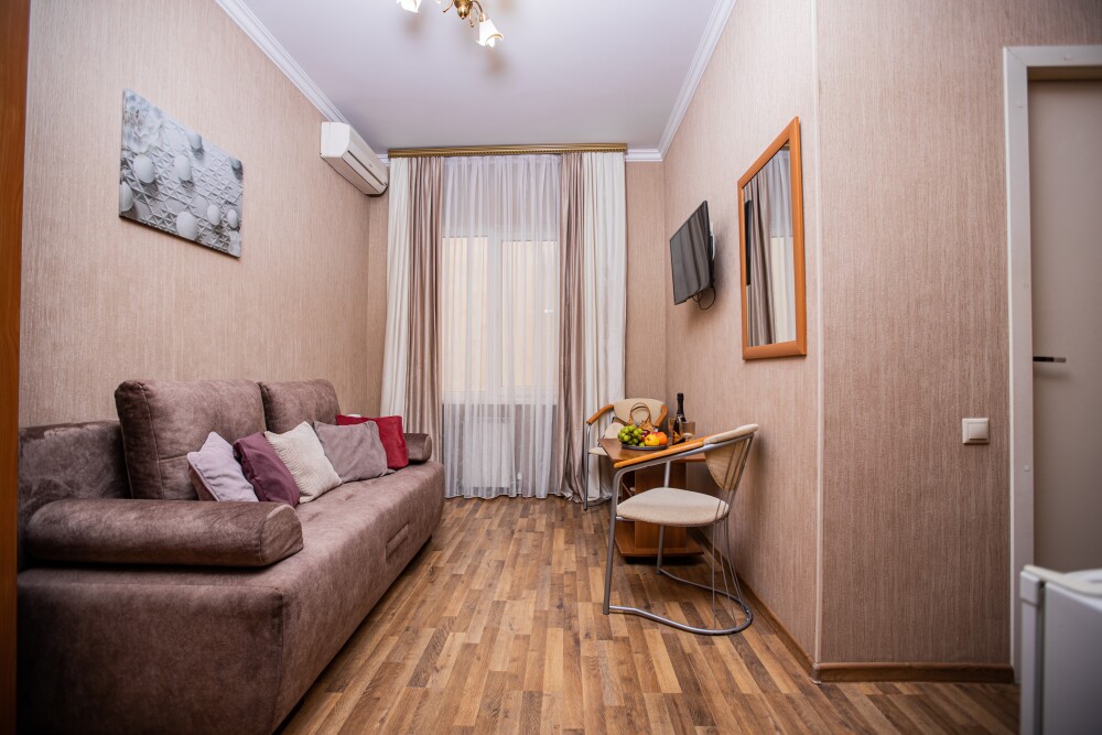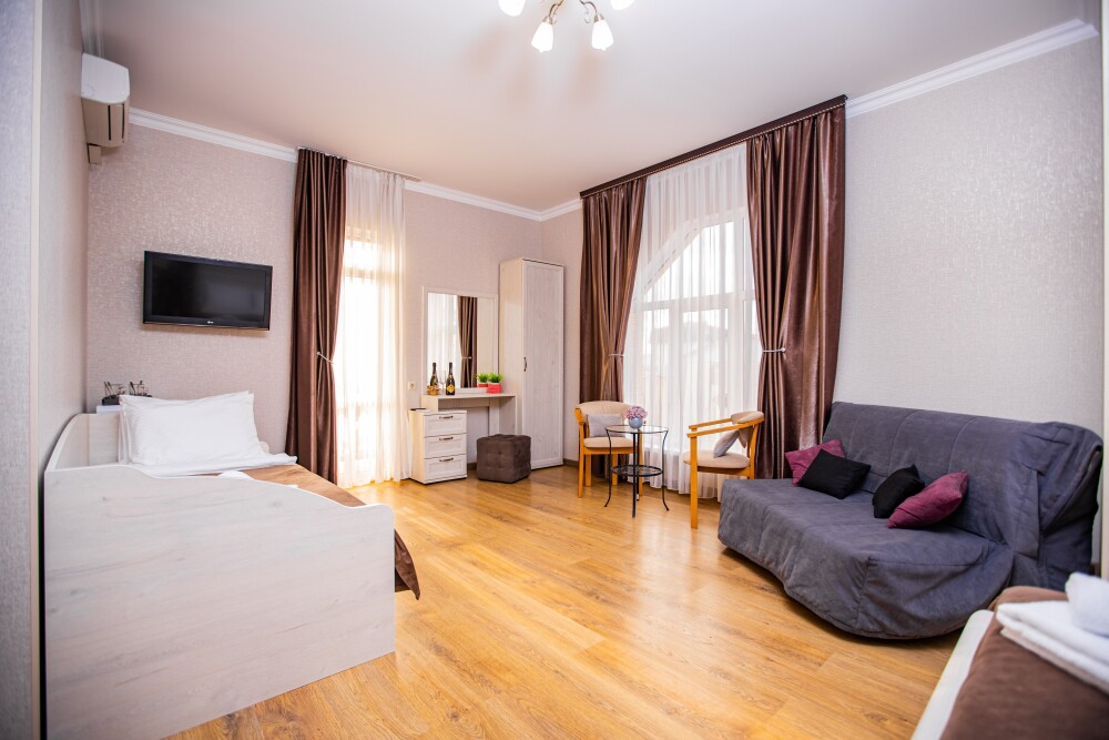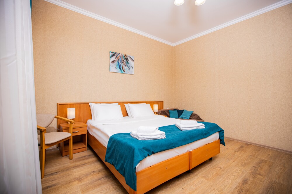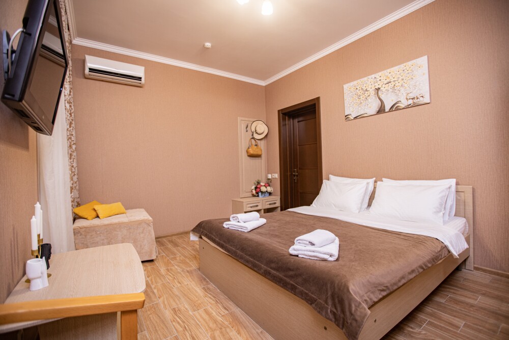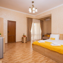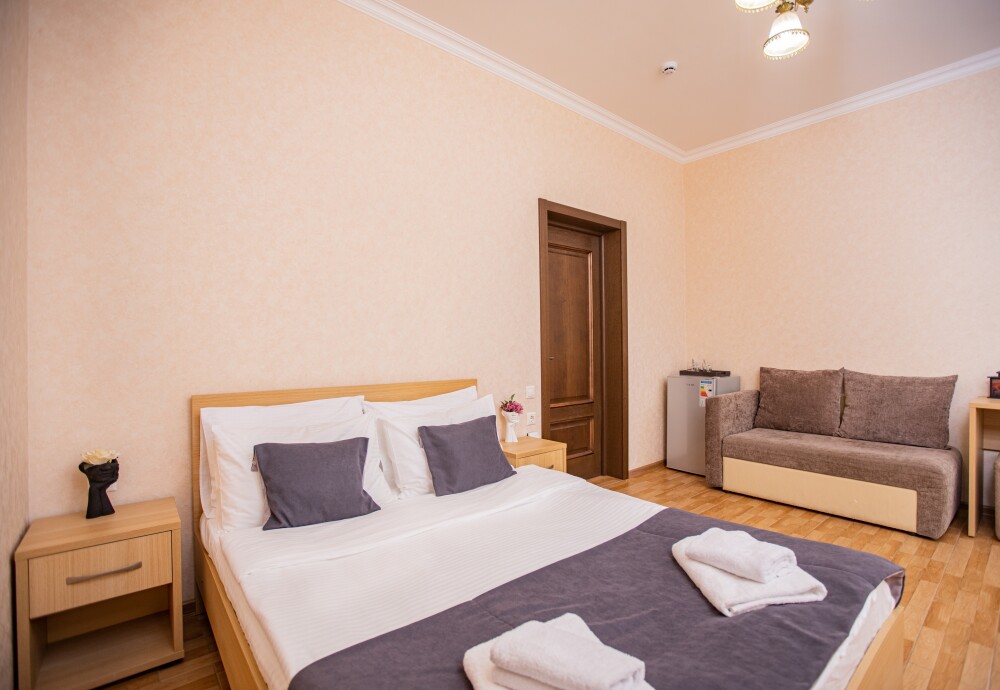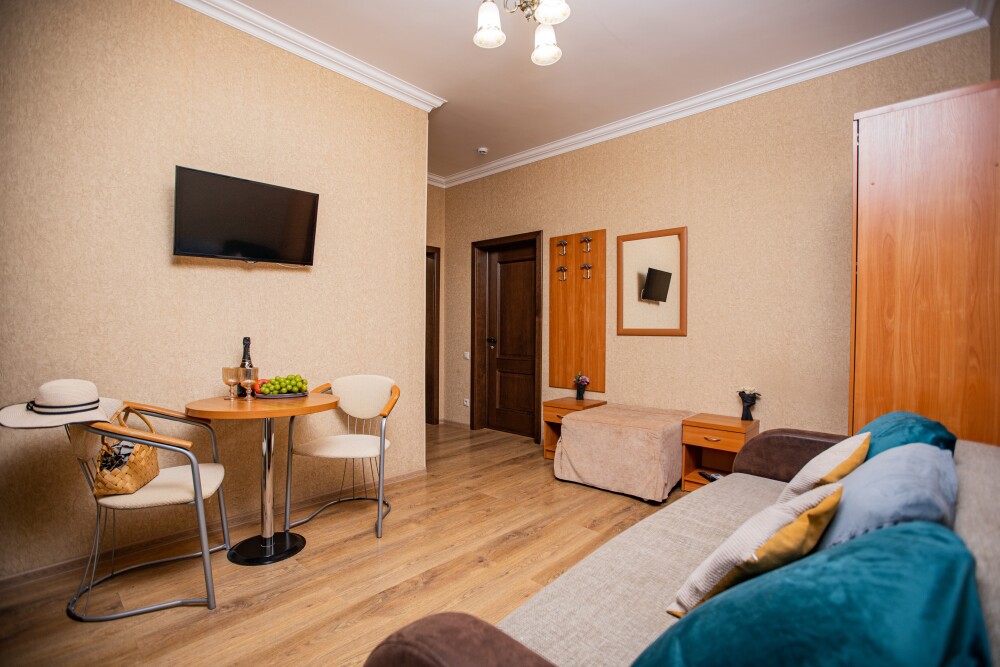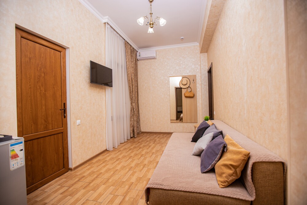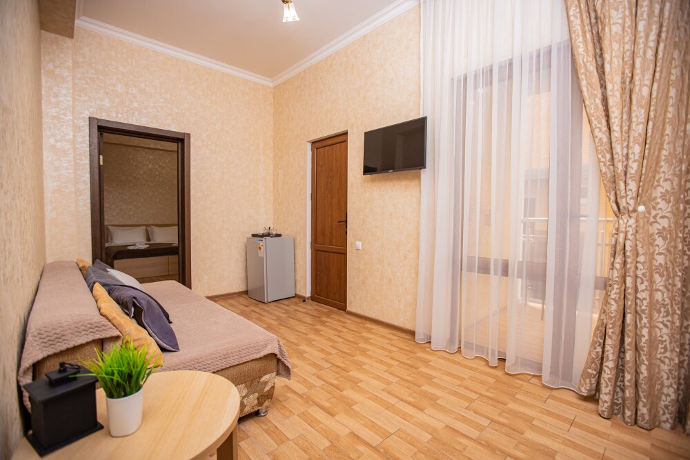 Номер площадью 20м2 - создан для комфортного размещения компании или семьи. В нём гармонично сочетаются двуспальная кровать для полноценного отдыха, удобный диван для дневных посиделок и мягкая софа - дополнительное спальное место. Кондиционер обеспечит приятную прохладу, телевизор подарит часы развлечений, а собственный балкон станет любимым местом для утреннего кофе или вечерних созерцаний. Всё необходимое, включая фен, уже подготовлено - Вам остаётся только наслаждаться отдыхом.