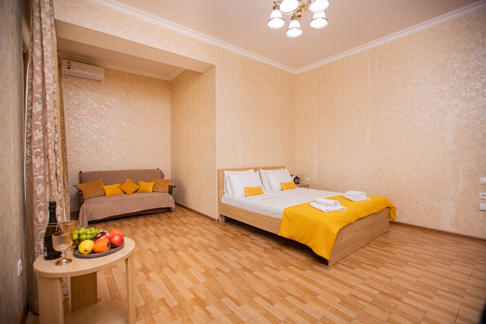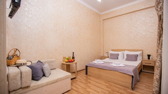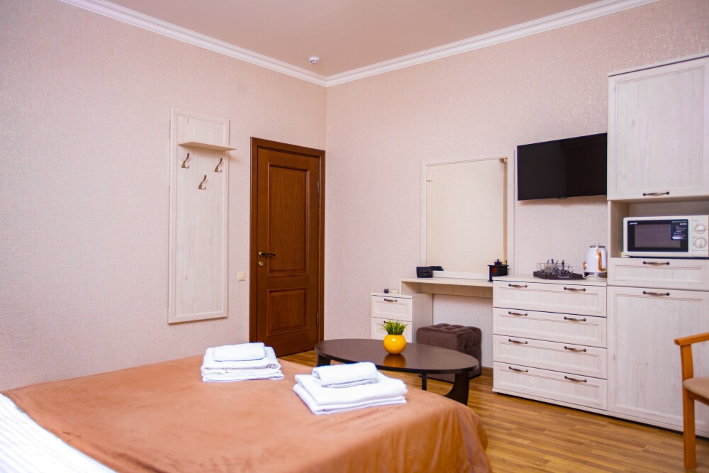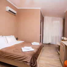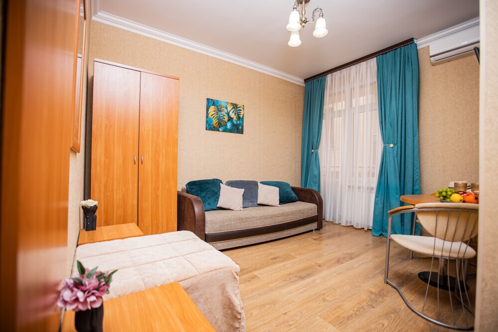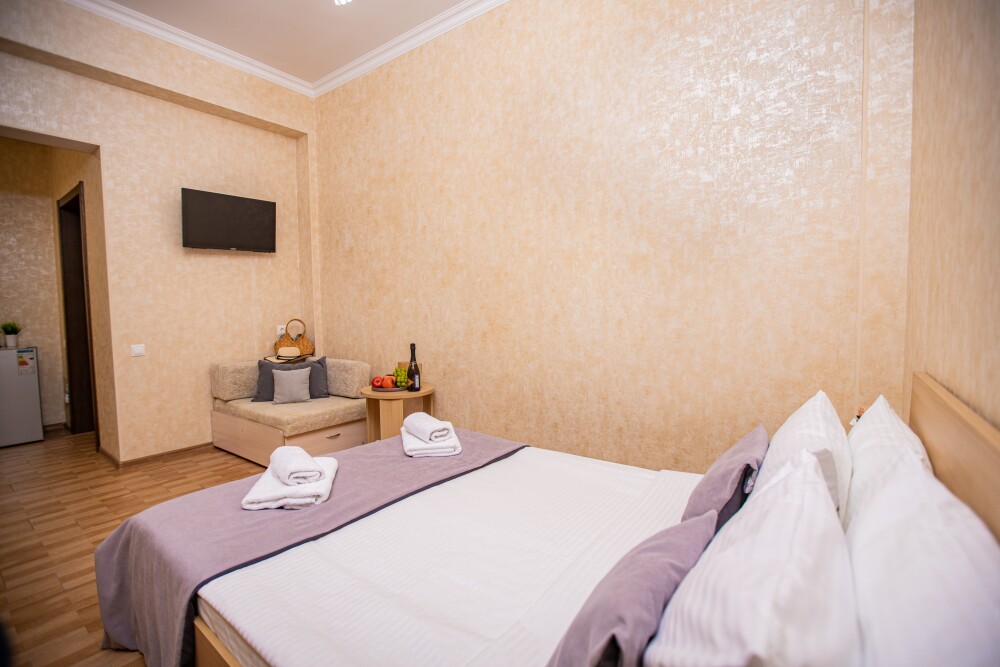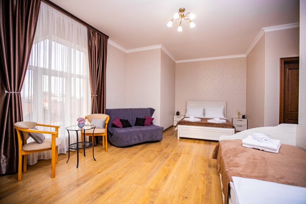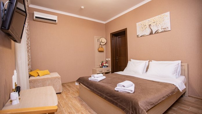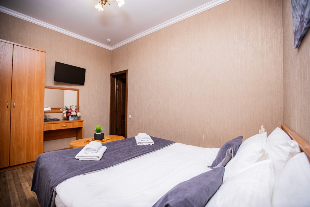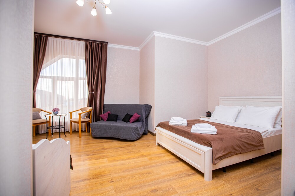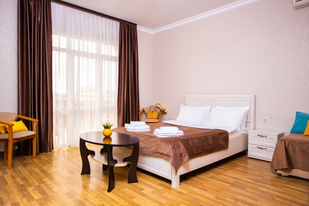 Номер площадью 20м2 - создан для комфортного размещения компании или семьи. В нём гармонично сочетаются двуспальная кровать для полноценного отдыха, удобный диван для дневных посиделок и мягкая софа - дополнительное спальное место. Кондиционер обеспечит приятную прохладу, телевизор подарит часы развлечений, а собственный балкон станет любимым местом для утреннего кофе или вечерних созерцаний. Всё необходимое, включая фен, уже подготовлено - Вам остаётся только наслаждаться отдыхом.