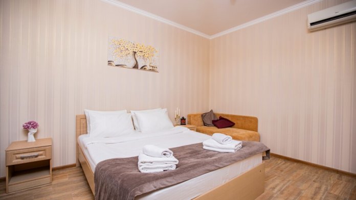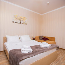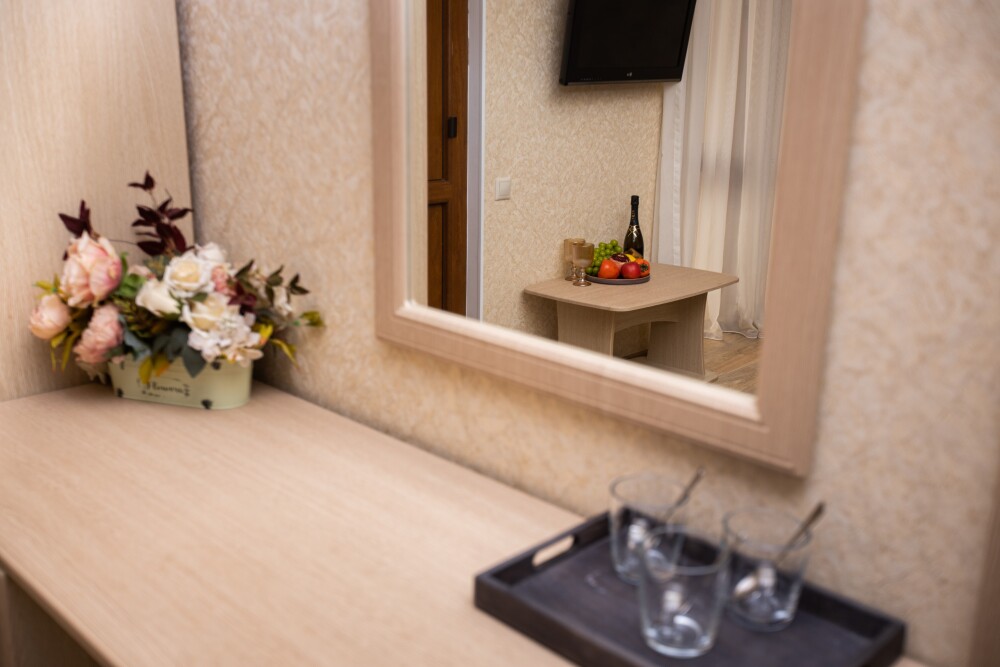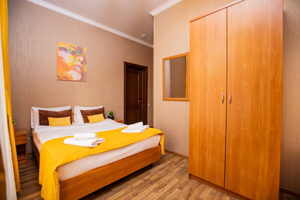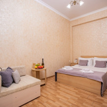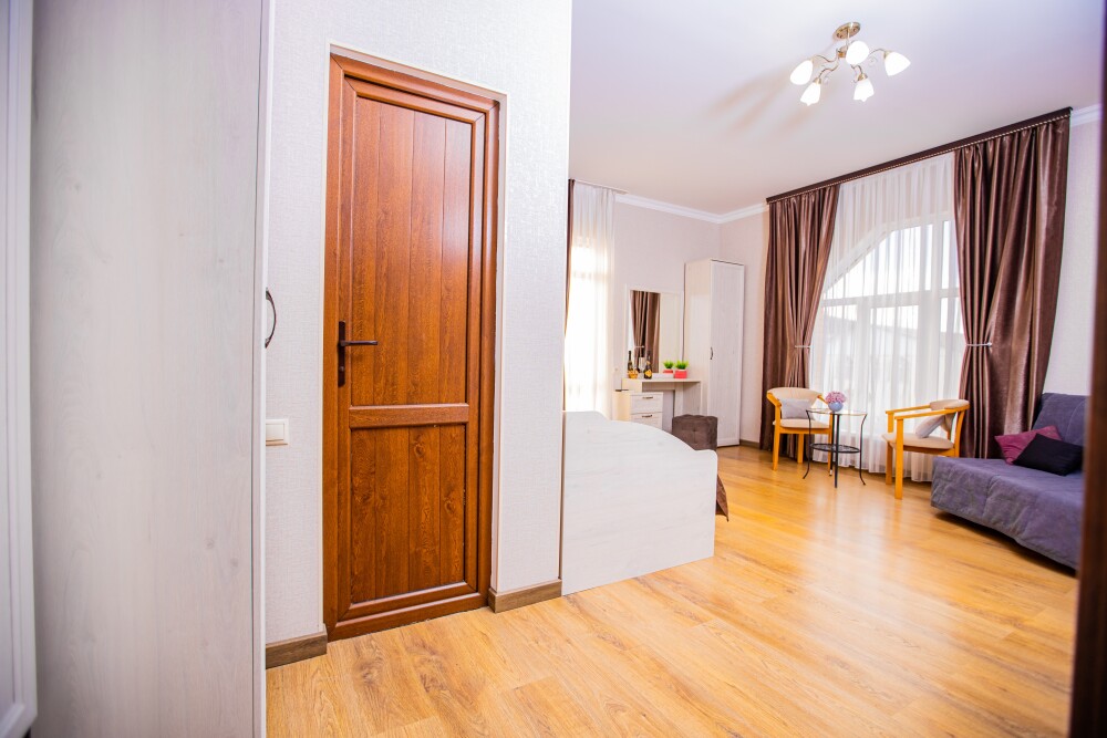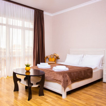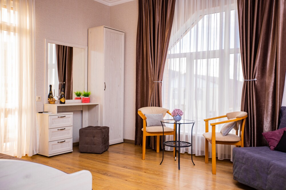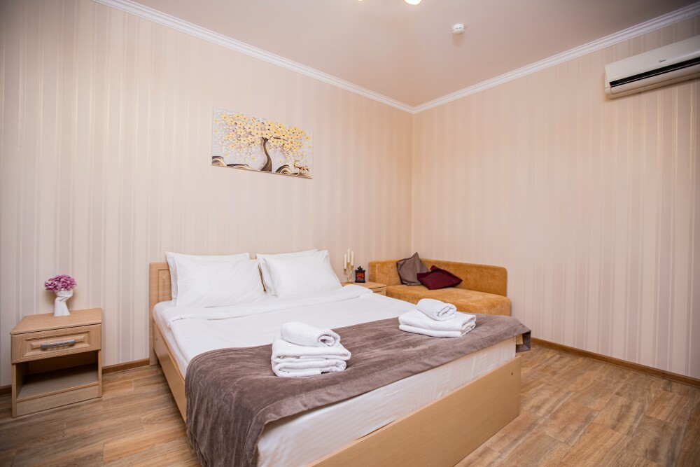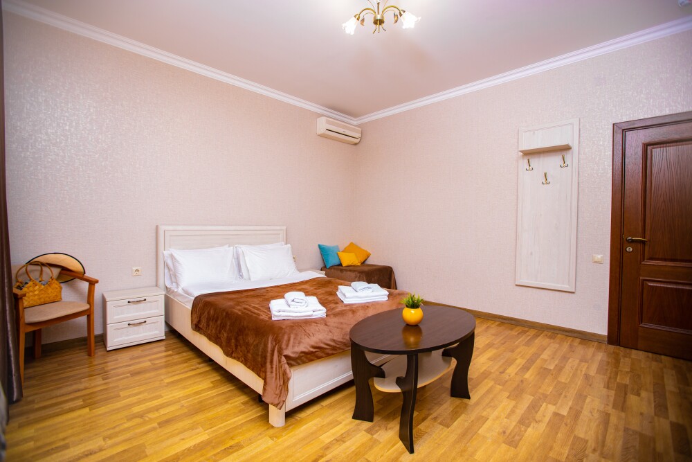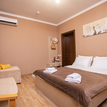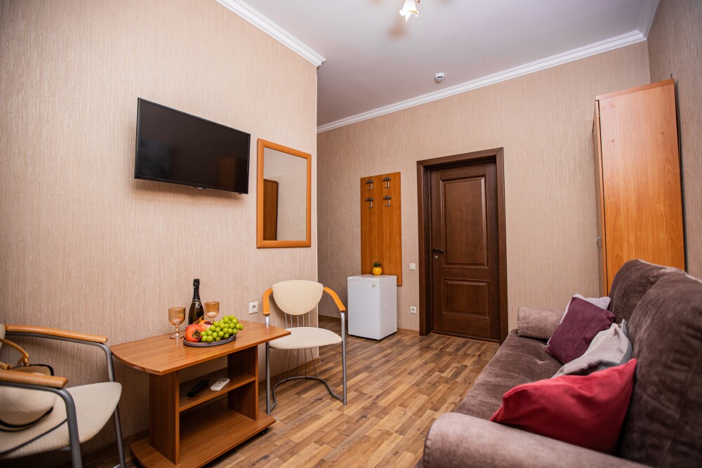 Номер площадью 20м2 - создан для комфортного размещения компании или семьи. В нём гармонично сочетаются двуспальная кровать для полноценного отдыха, удобный диван для дневных посиделок и мягкая софа - дополнительное спальное место. Кондиционер обеспечит приятную прохладу, телевизор подарит часы развлечений, а собственный балкон станет любимым местом для утреннего кофе или вечерних созерцаний. Всё необходимое, включая фен, уже подготовлено - Вам остаётся только наслаждаться отдыхом.