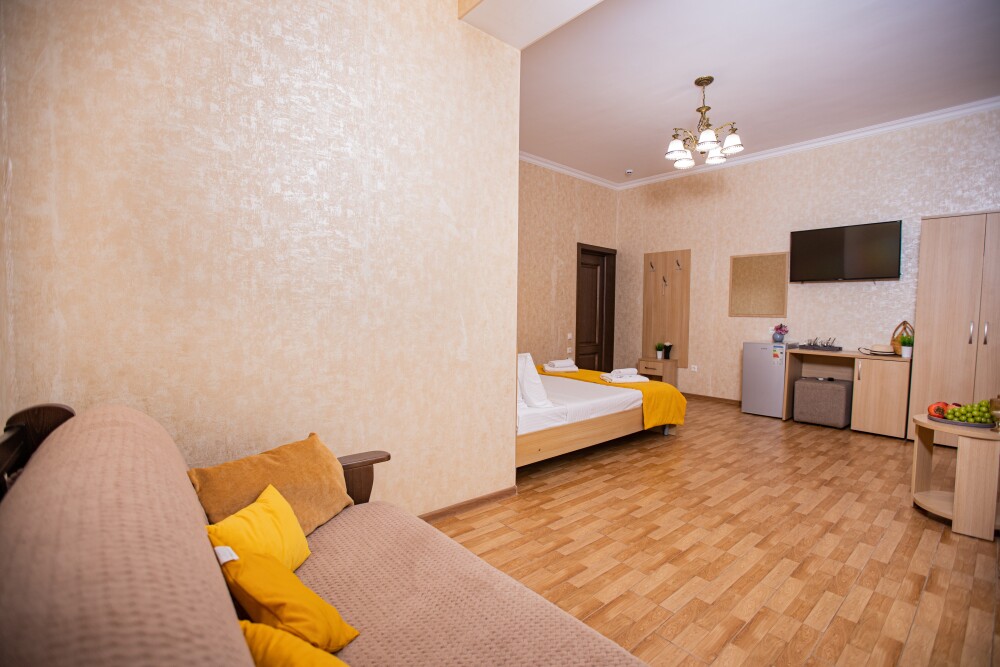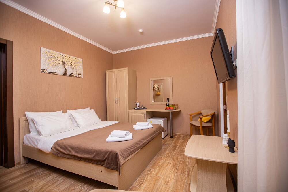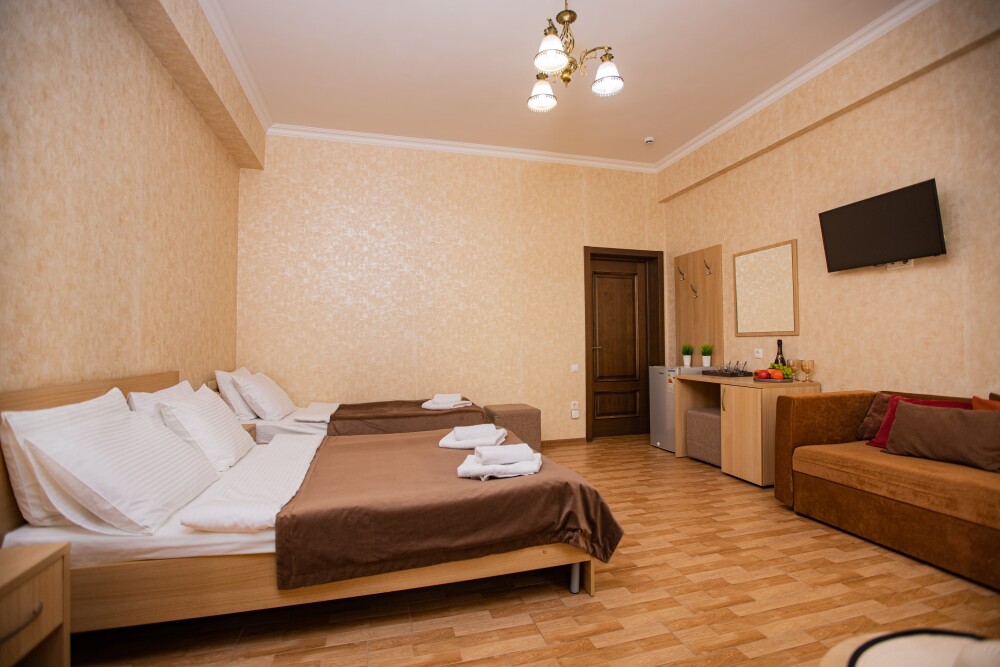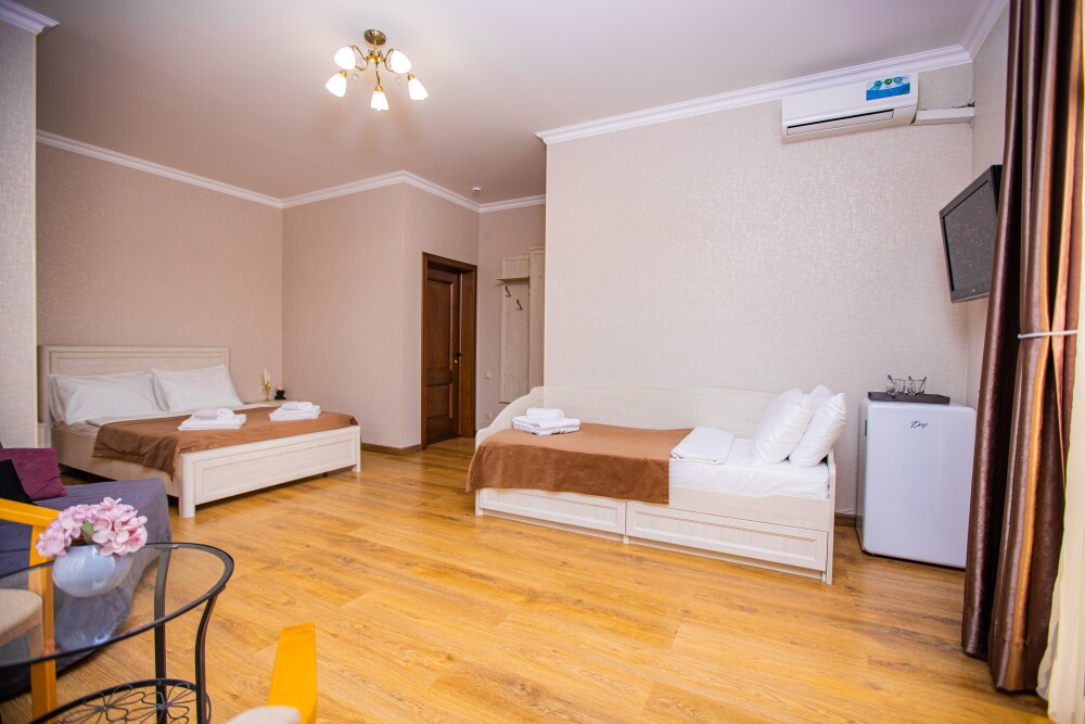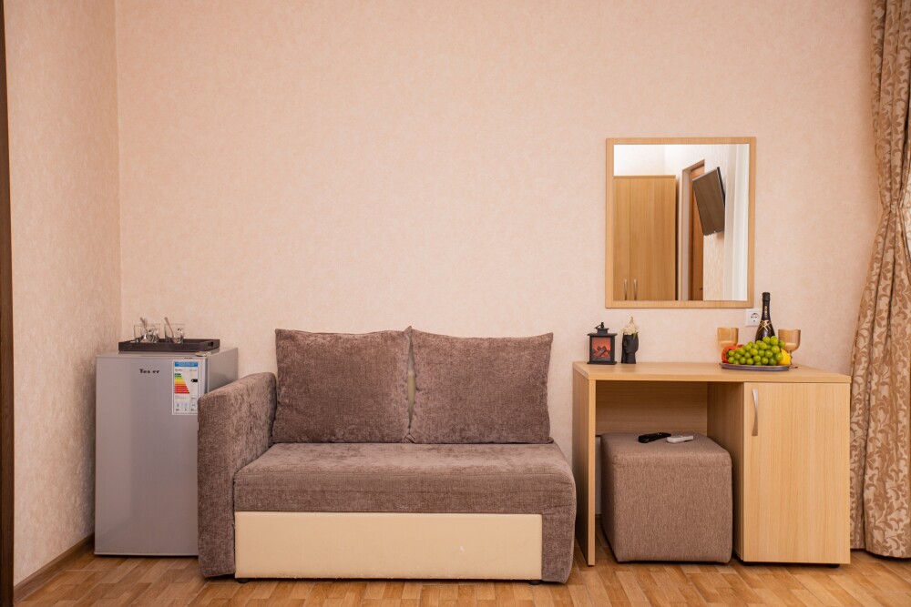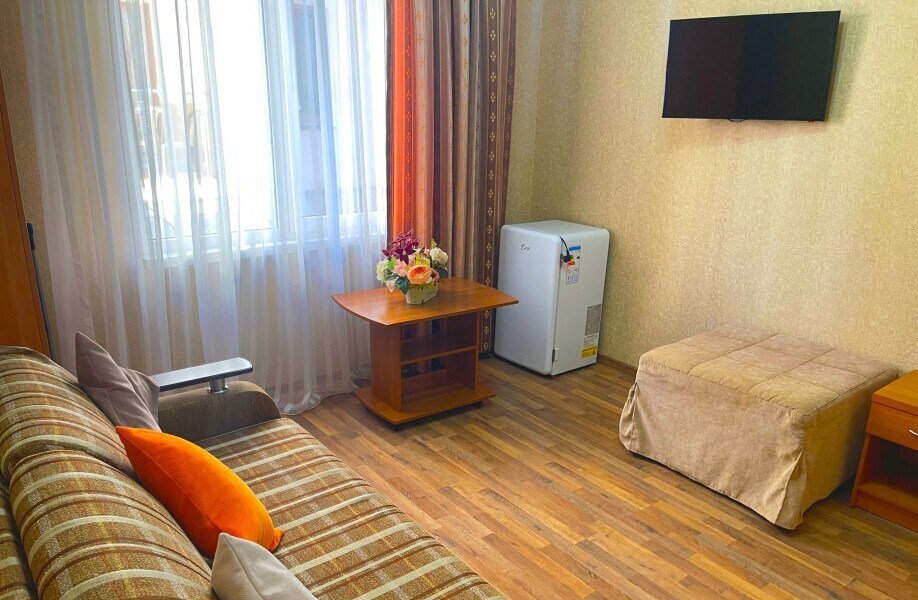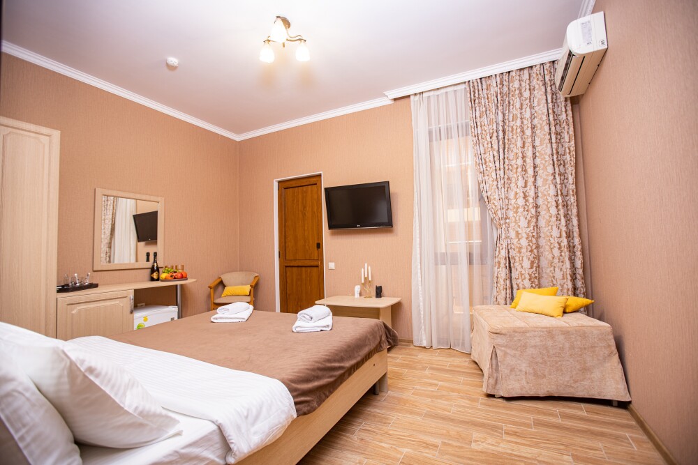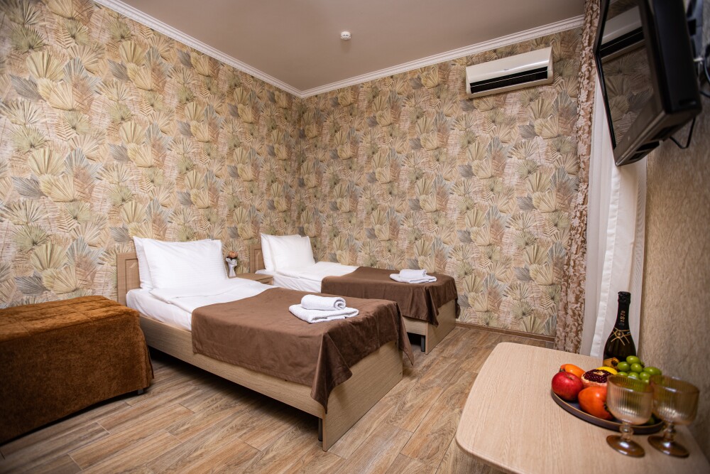Просторный стандартный номер (20 м2) идеально подходит для размещения четырёх гостей. Продуманная планировка включает: удобную двуспальную кровать для полноценного отдыха, односпальную кровать и мягкую софу — два дополнительных спальных места. В номере есть всё необходимое для комфорта: кондиционер поддерживает оптимальную температуру, телевизор создаёт настроение для вечернего досуга, а собственный балкон приглашает насладиться свежим воздухом. Фен и прочие удобства уже на месте — остаётся только заселяться и чувствовать себя как дома.