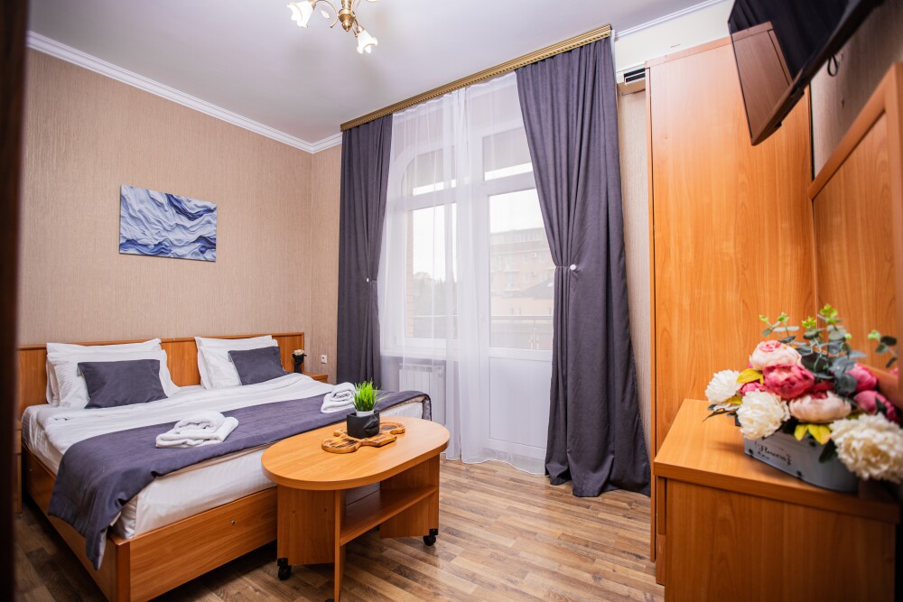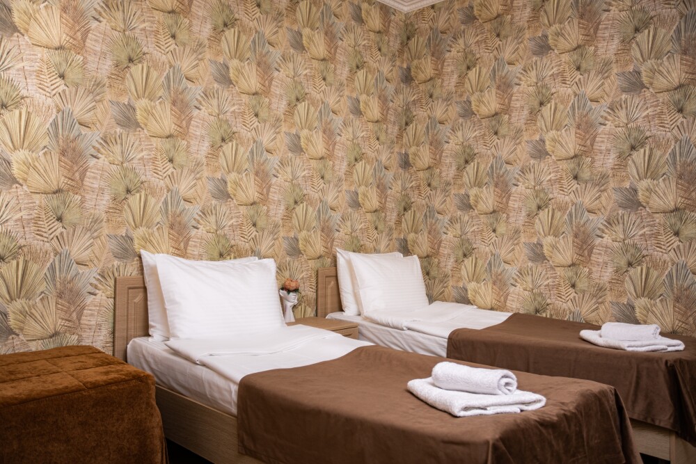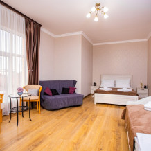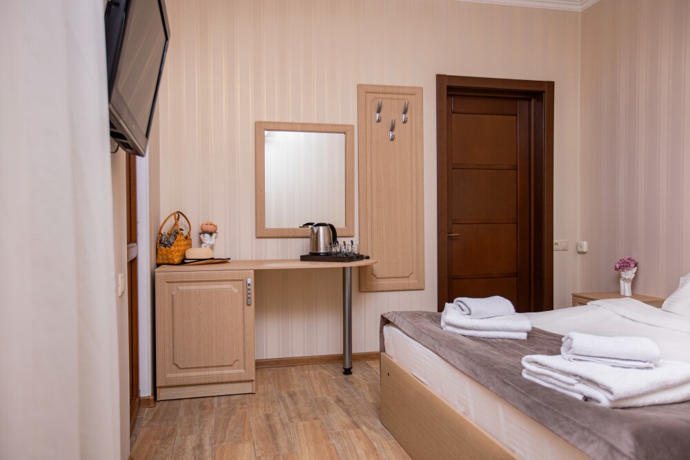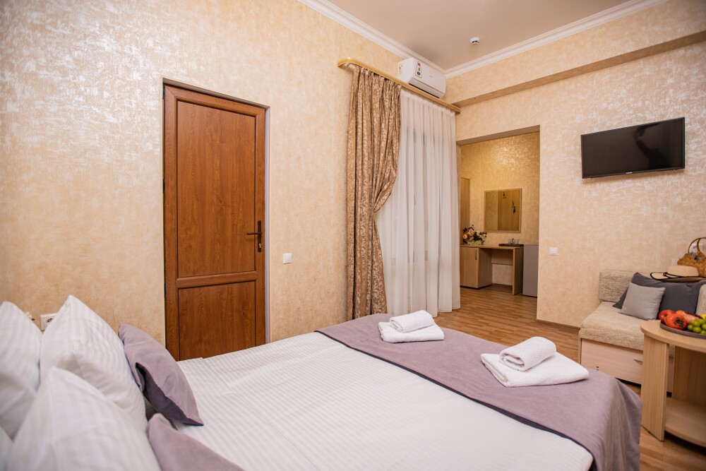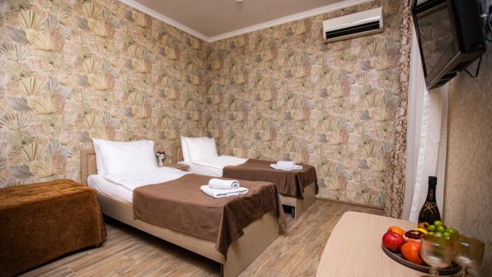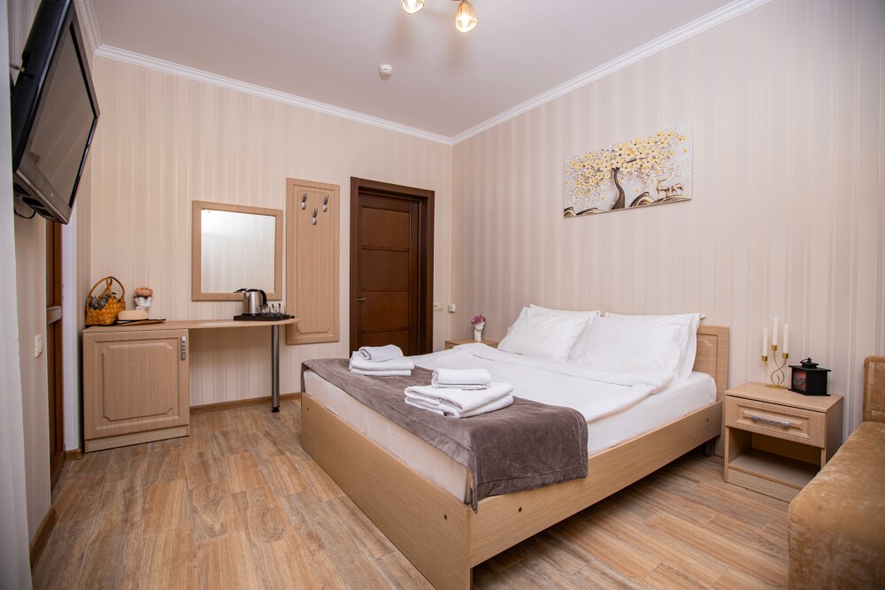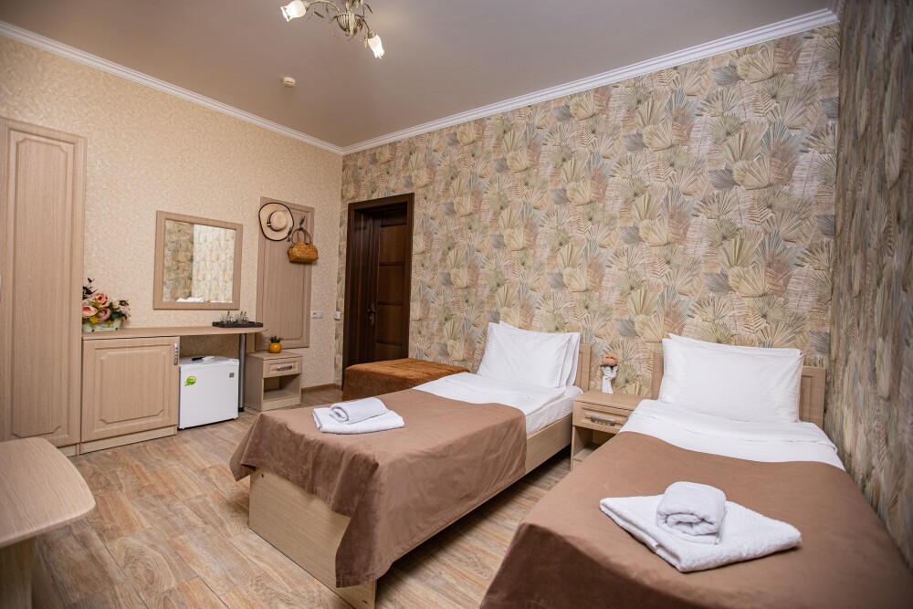Просторный стандартный номер (20 м2) идеально подходит для размещения четырёх гостей. Продуманная планировка включает: удобную двуспальную кровать для полноценного отдыха, односпальную кровать и мягкую софу — два дополнительных спальных места. В номере есть всё необходимое для комфорта: кондиционер поддерживает оптимальную температуру, телевизор создаёт настроение для вечернего досуга, а собственный балкон приглашает насладиться свежим воздухом. Фен и прочие удобства уже на месте — остаётся только заселяться и чувствовать себя как дома.