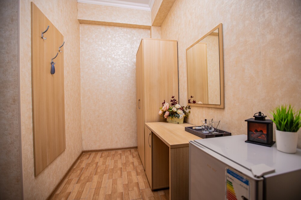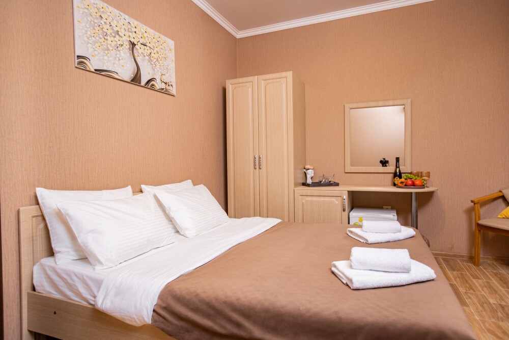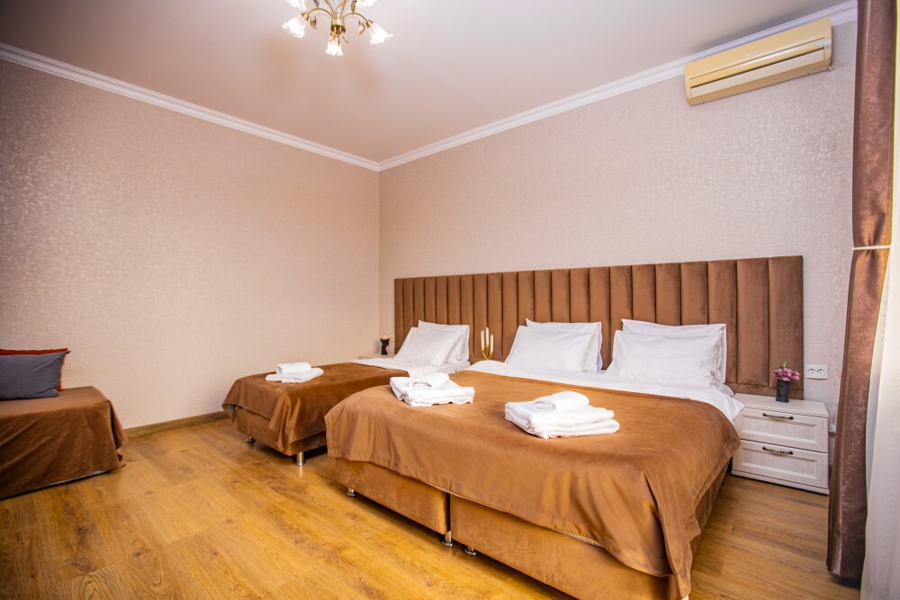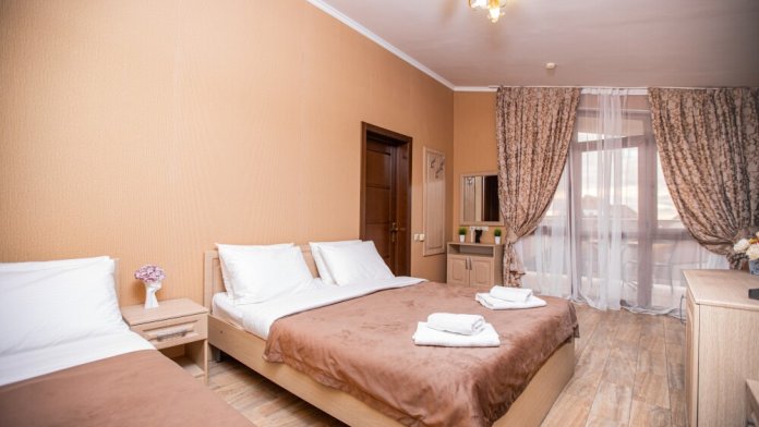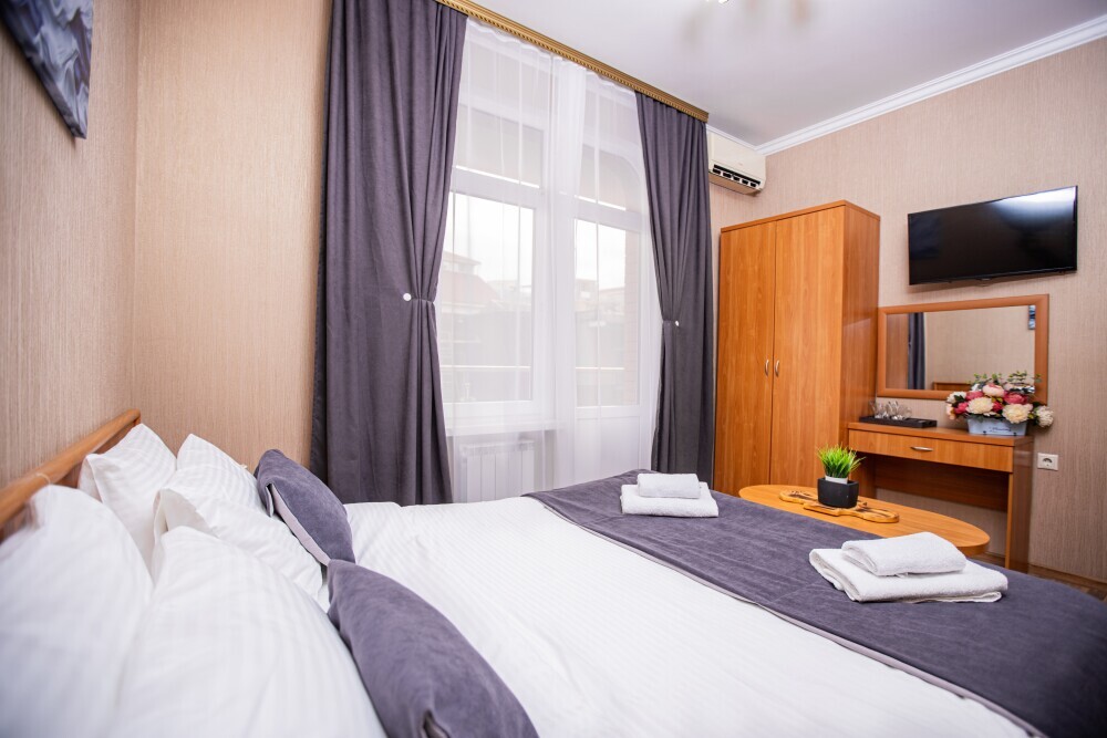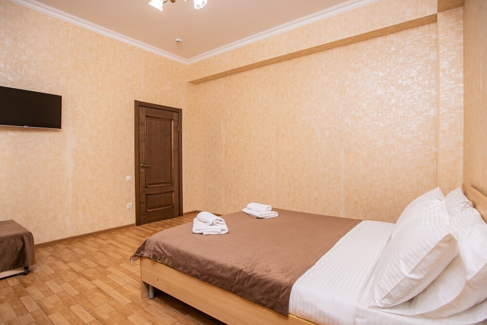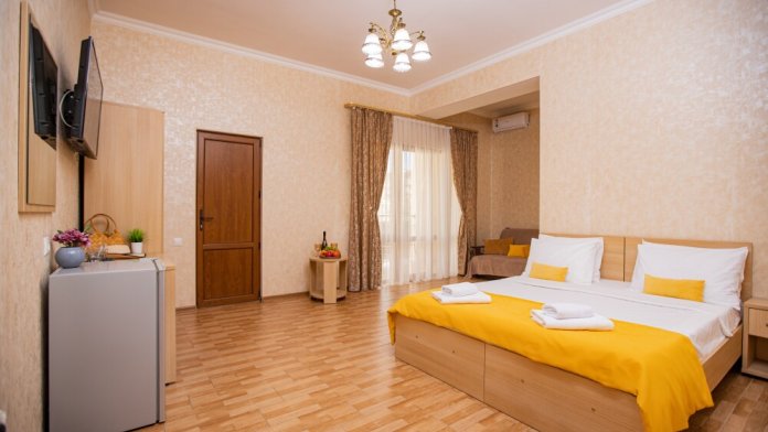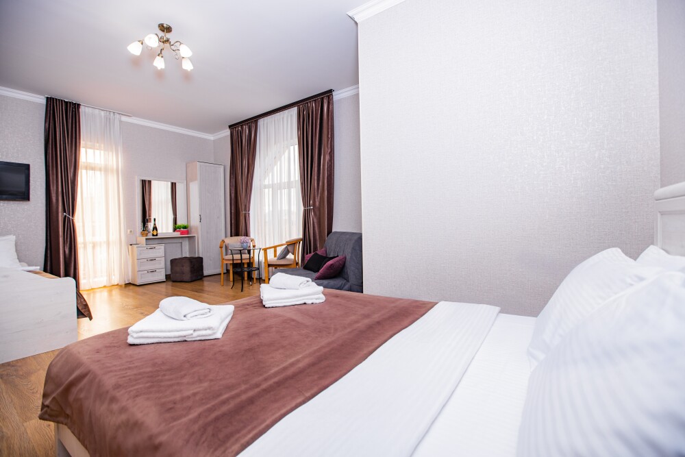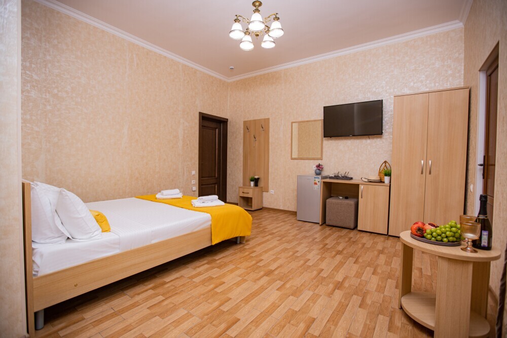 Просторный стандартный номер (20 м2) идеально подходит для размещения четырёх гостей. Продуманная планировка включает: удобную двуспальную кровать для полноценного отдыха, односпальную кровать и мягкую софу — два дополнительных спальных места. В номере есть всё необходимое для комфорта: кондиционер поддерживает оптимальную температуру, телевизор создаёт настроение для вечернего досуга, а собственный балкон приглашает насладиться свежим воздухом. Фен и прочие удобства уже на месте — остаётся только заселяться и чувствовать себя как дома.