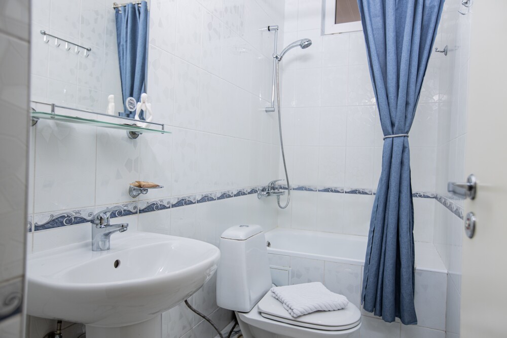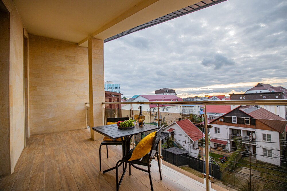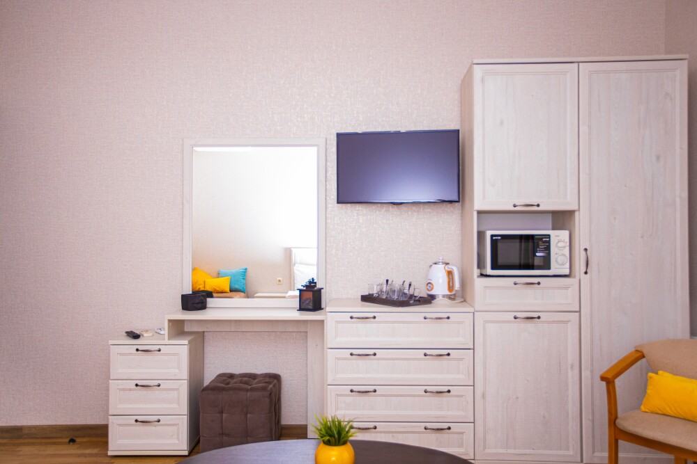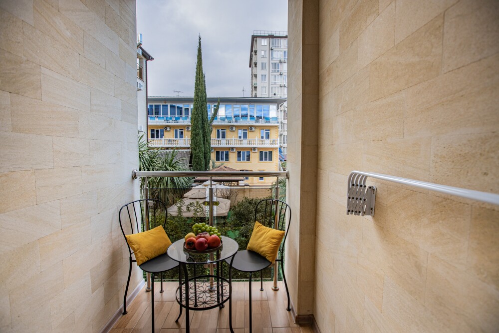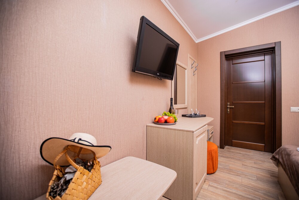Номер категории «Комфорт» (25 м2) создан для безмятежного отдыха двоих. Центром пространства стала просторная двуспальная кровать — идеальное место для крепкого сна. Кондиционер поддерживает приятную прохладу, телевизор дарит вечерние развлечения, а фен и прочие мелочи уже ждут вас. Особая гордость номера — просторная терраса с панорамным видом на море: здесь можно встречать рассветы, провожать закаты или просто наслаждаться морским бризом в любое время суток.