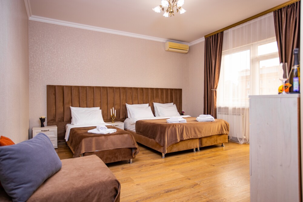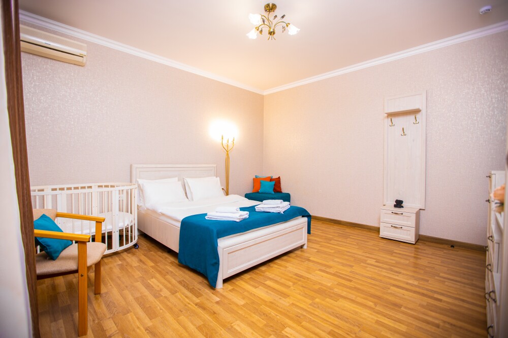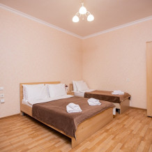 Просторный двухкомнатный номер создан для комфортного отдыха компании до 5 человек. В первой комнате - двуспальная кровать с ортопедическим матрасом, во второй - односпальная кровать и мягкий диван‑софа, легко трансформируемые в 2 дополнительных спальных места. Кондиционер поддерживает идеальную температуру, телевизор дарит часы развлечений, а балкон становится любимым местом для утреннего кофе или вечерних бесед. Всё необходимое - от фена до мелочей - уже подготовлено, чтобы Вы чувствовали себя как дома.