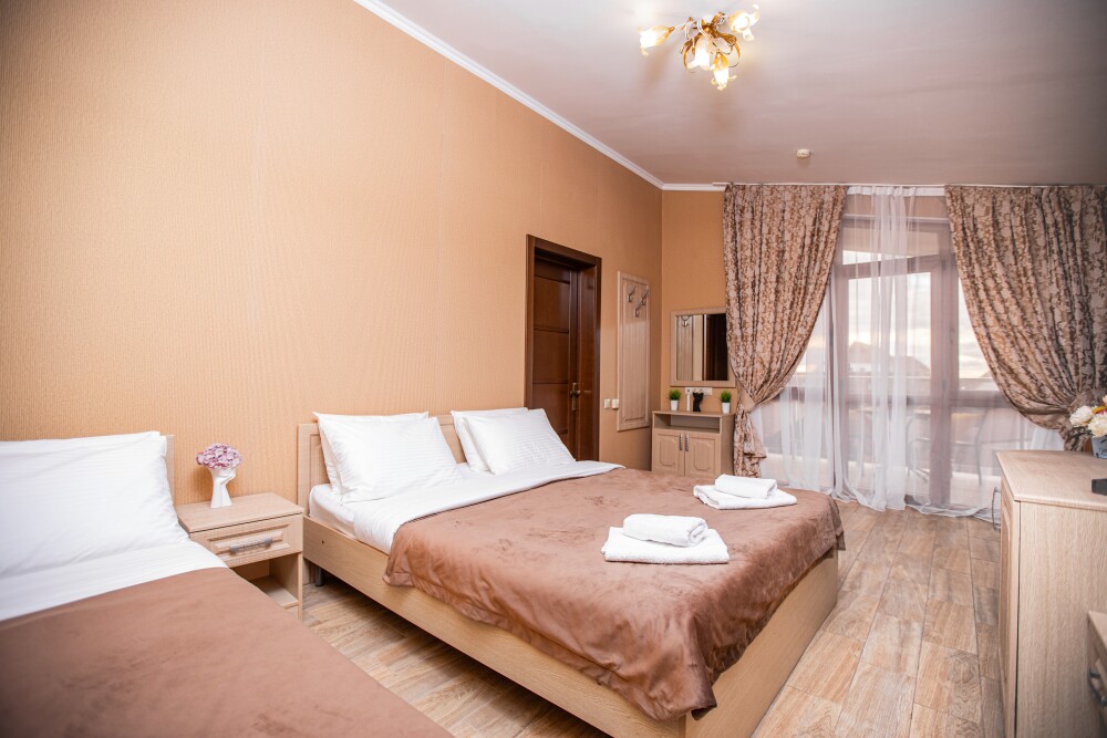 Этот стандартный номер (20м2) создан, чтобы вы чувствовали себя как дома. Двуспальная кровать приглашает к полноценному отдыху, а односпальная легко разместит ребёнка или гостя. Кондиционер подарит свежесть, телевизор - разнообразие досуга, а балкон станет вашим личным пространством для размышлений или чаепитий. Всё необходимое - от фена до мелочей - уже на месте.