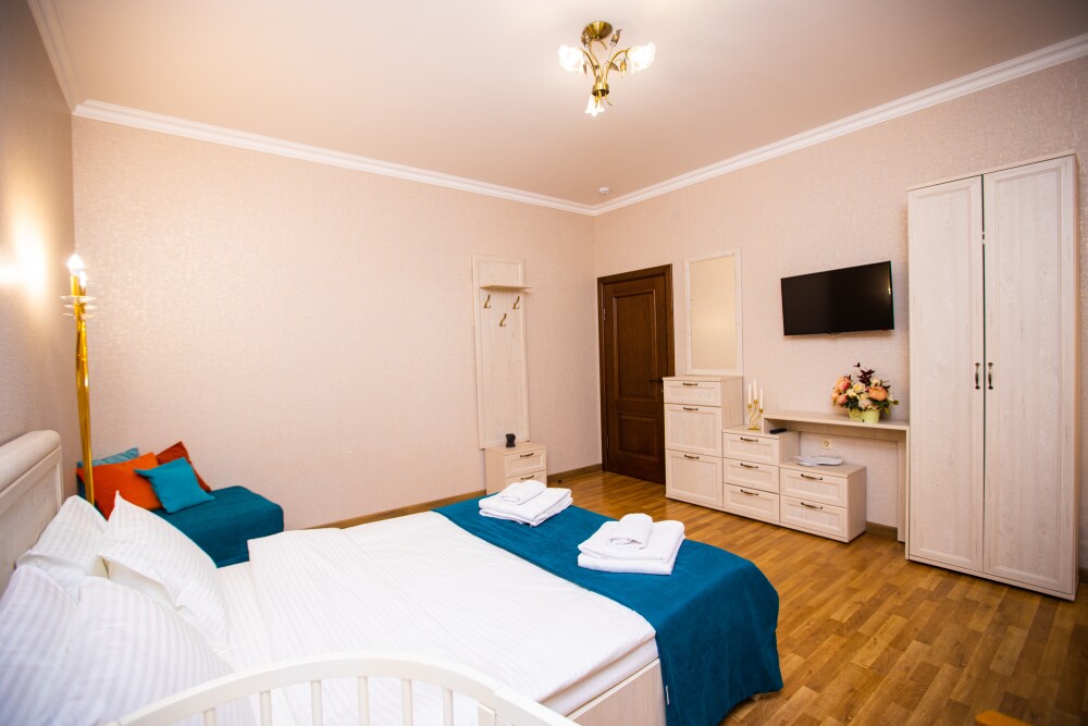 Семейный двухкомнатный номер (28 м2) — идеальное решение для комфортного отдыха с детьми. В первой комнате расположена просторная двуспальная кровать с ортопедическим основанием, гарантирующая крепкий сон. Вторая комната оборудована односпальной кроватью и удобным диваном — здесь с комфортом разместится ребёнок или гость. Современные удобства включают кондиционер для поддержания оптимальной температуры, телевизор для вечерних просмотров и фен для утренних сборов. Особая прелесть номера — собственный балкон, где можно выпить чай на рассвете или полюбоваться вечерними огнями.