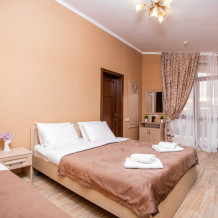 Светлый и просторный номер (25м2) - сочетает современный дизайн и функциональность. Двуспальная кровать с качественным постельным бельём приглашает к отдыху, односпальная кровать обеспечивает дополнительное спальное место, а двухместный диван создаёт комфортную зону для общения. Кондиционер регулирует микроклимат, телевизор добавляет разнообразия, а балкон открывает возможность насладиться свежим воздухом. Фен и все необходимые принадлежности уже на месте — в- Вам остаётся только расслабиться.