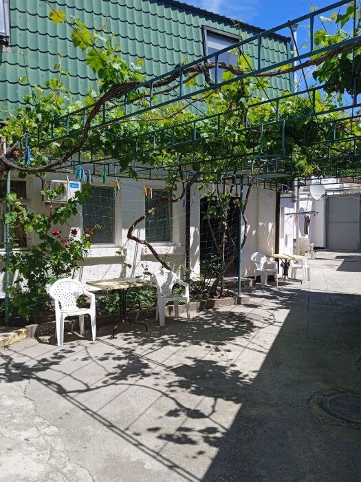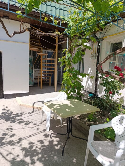 Стиральная машинка стоит в отдельном помещении, во дворе свой комплект мебели для отдыха (стол и кресла) в тени винограда и ореха.