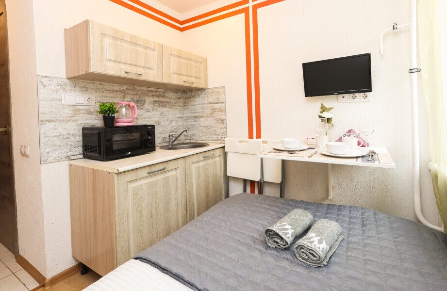 - Кухня с холодильником, плитой, микроволновкой, чайником и посудой.