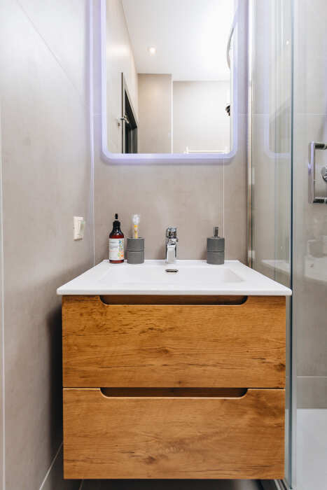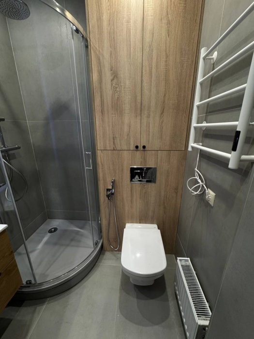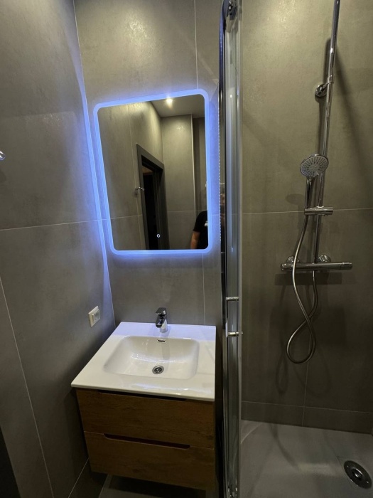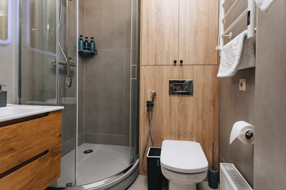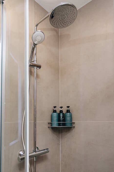 Ванная комната с душем и всеми средствами гигиены.