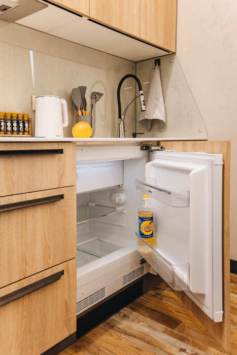 В квартире есть все, что может понадобиться для приготовления еды. Также есть вся посуда для комфортного проживания: ножи, столовые приборы на 4 человек, кастрюли, сковородки, тарелки, бокалы и многое другое включено, если снять квартиру у нас.