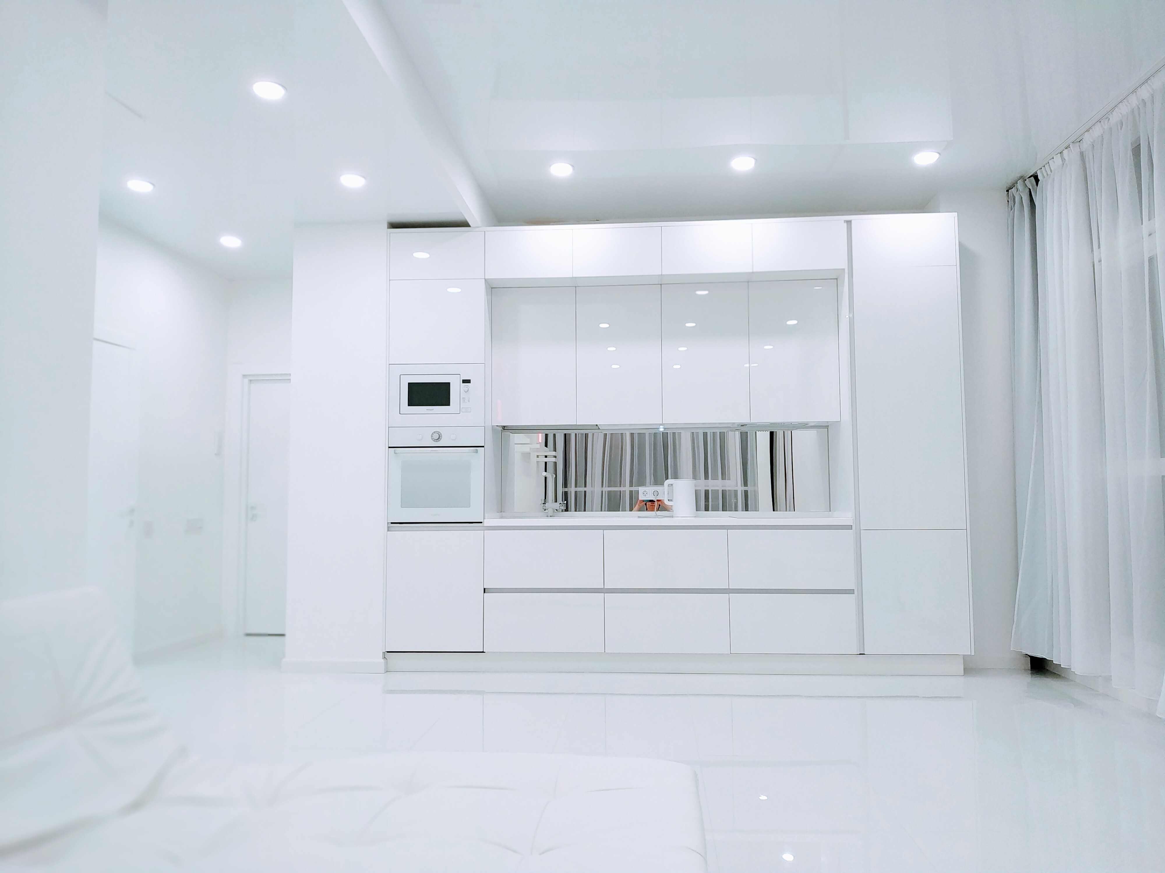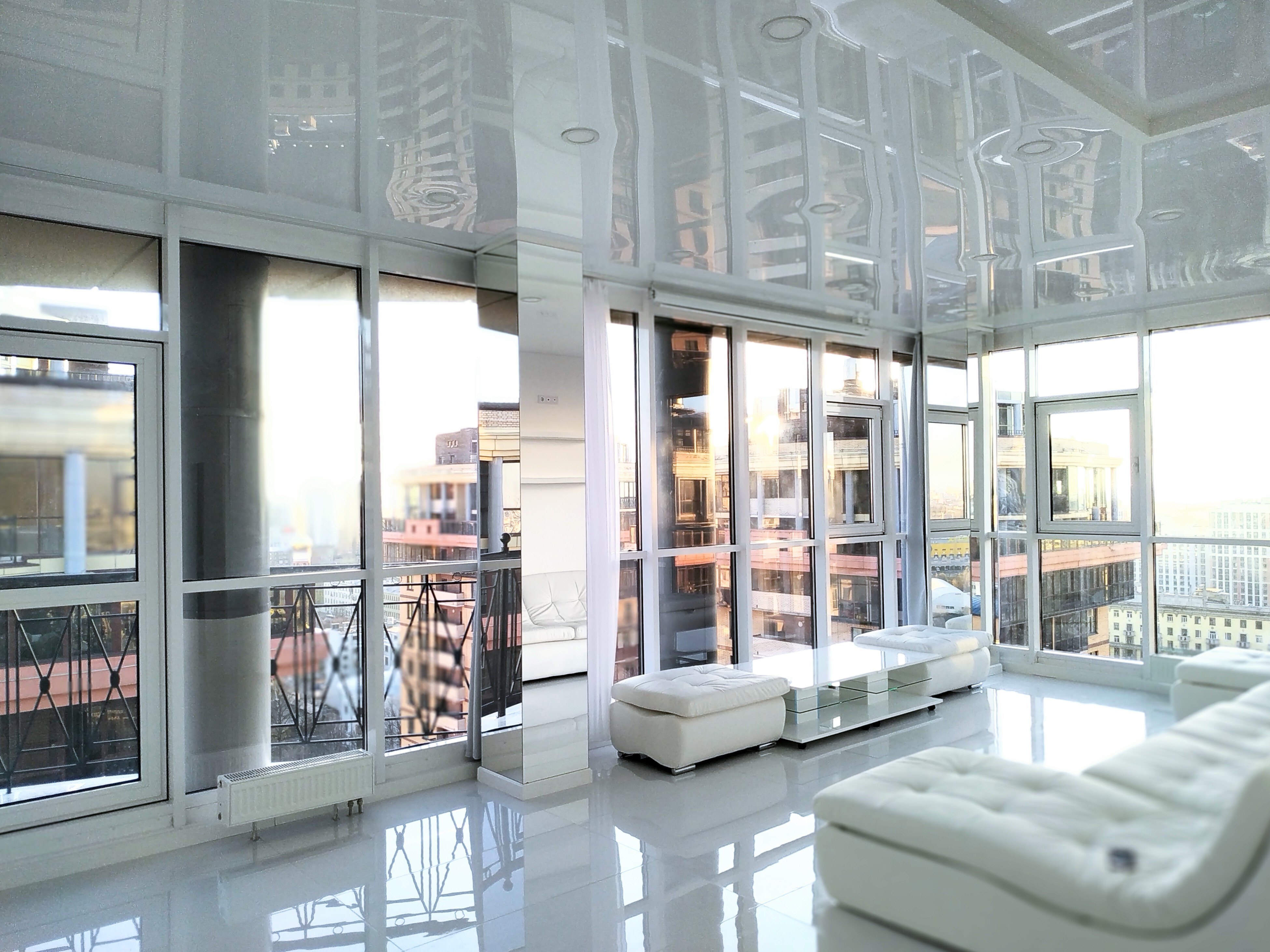 - Белоснежный интерьер с панорамным видом и балконом;