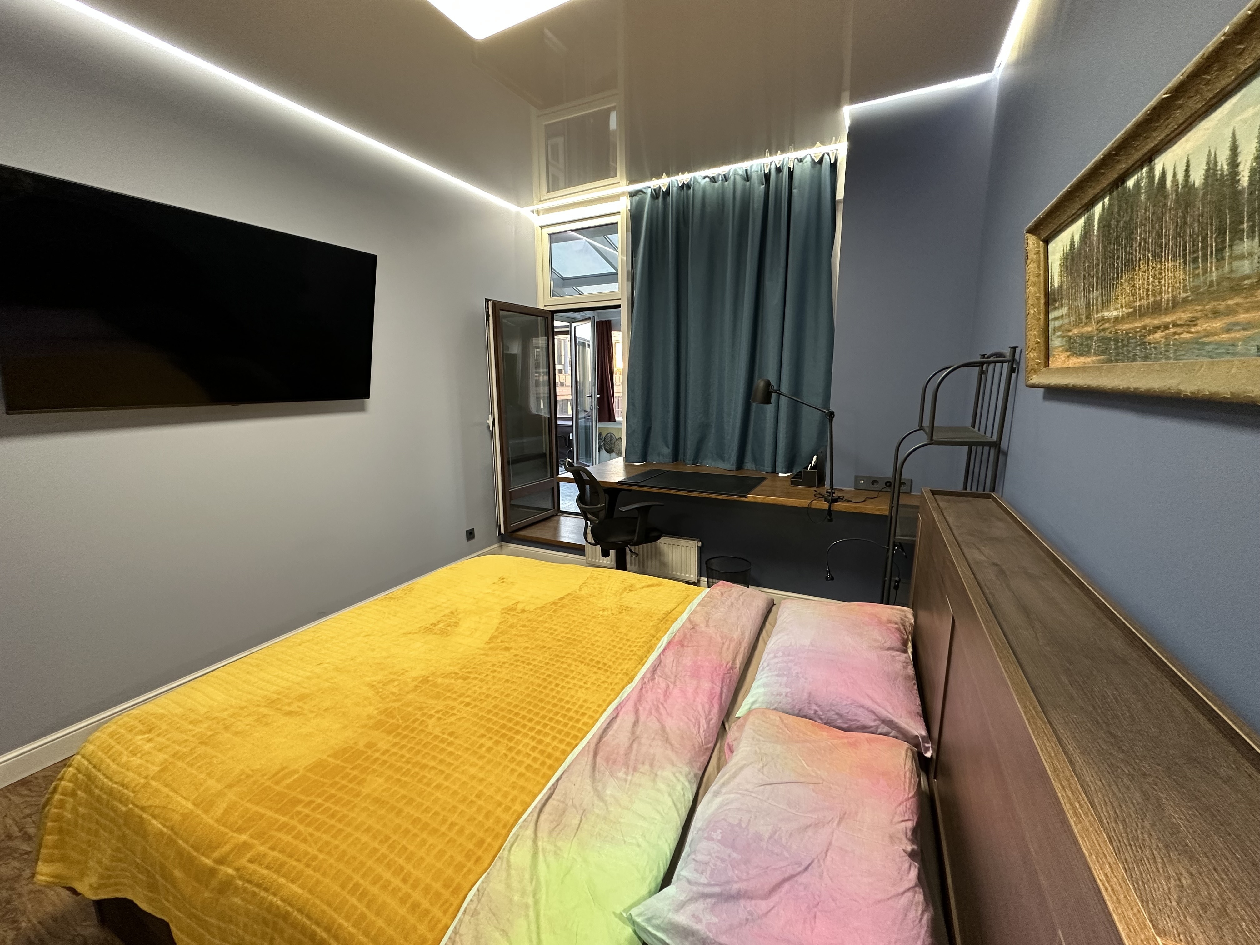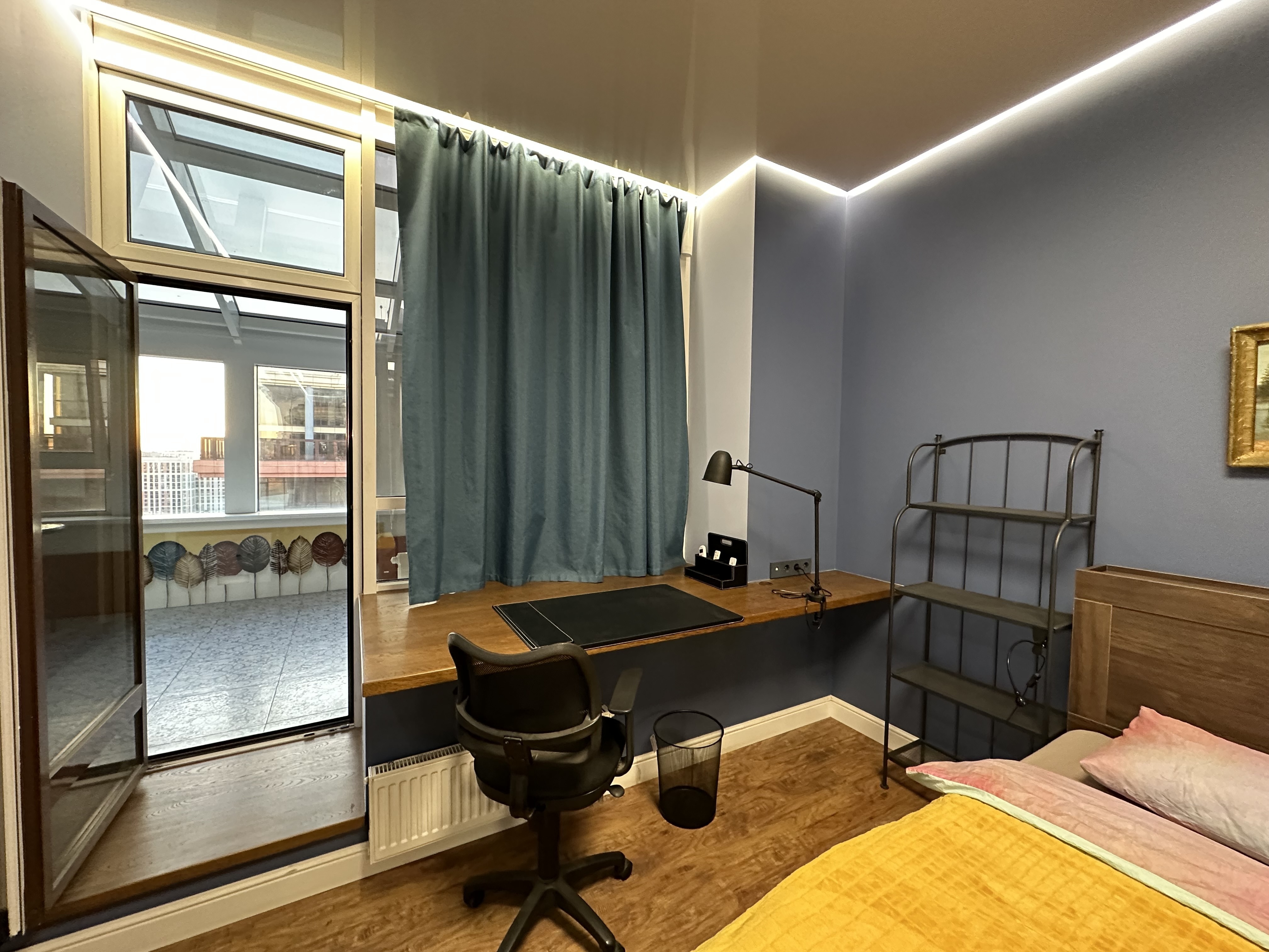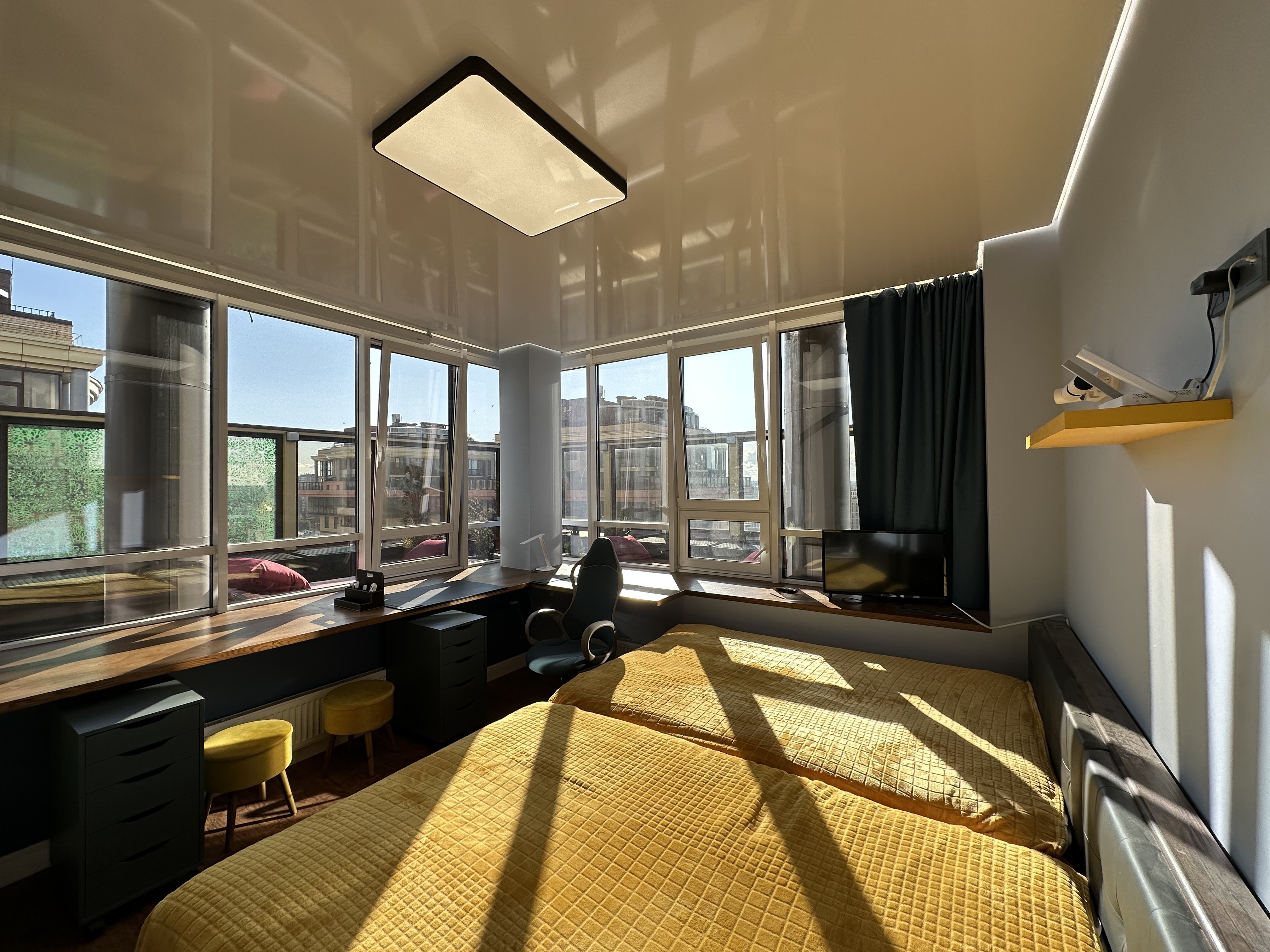 Первая спальня с выходом в остеклённый зимний сад и открытую террасу (40 м²), откуда открываются панорамные виды на город.