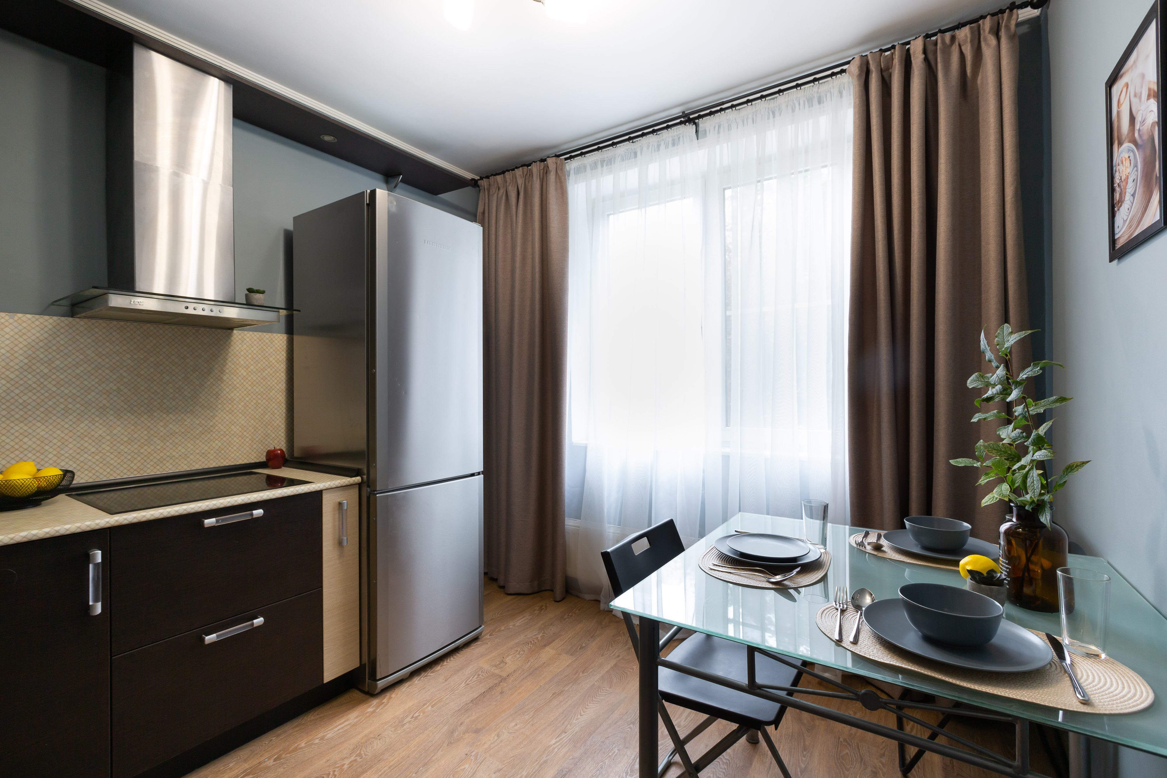 - плита, микроволновка, духовка, вытяжка, посудомоечная машина, чайник, холодильник;