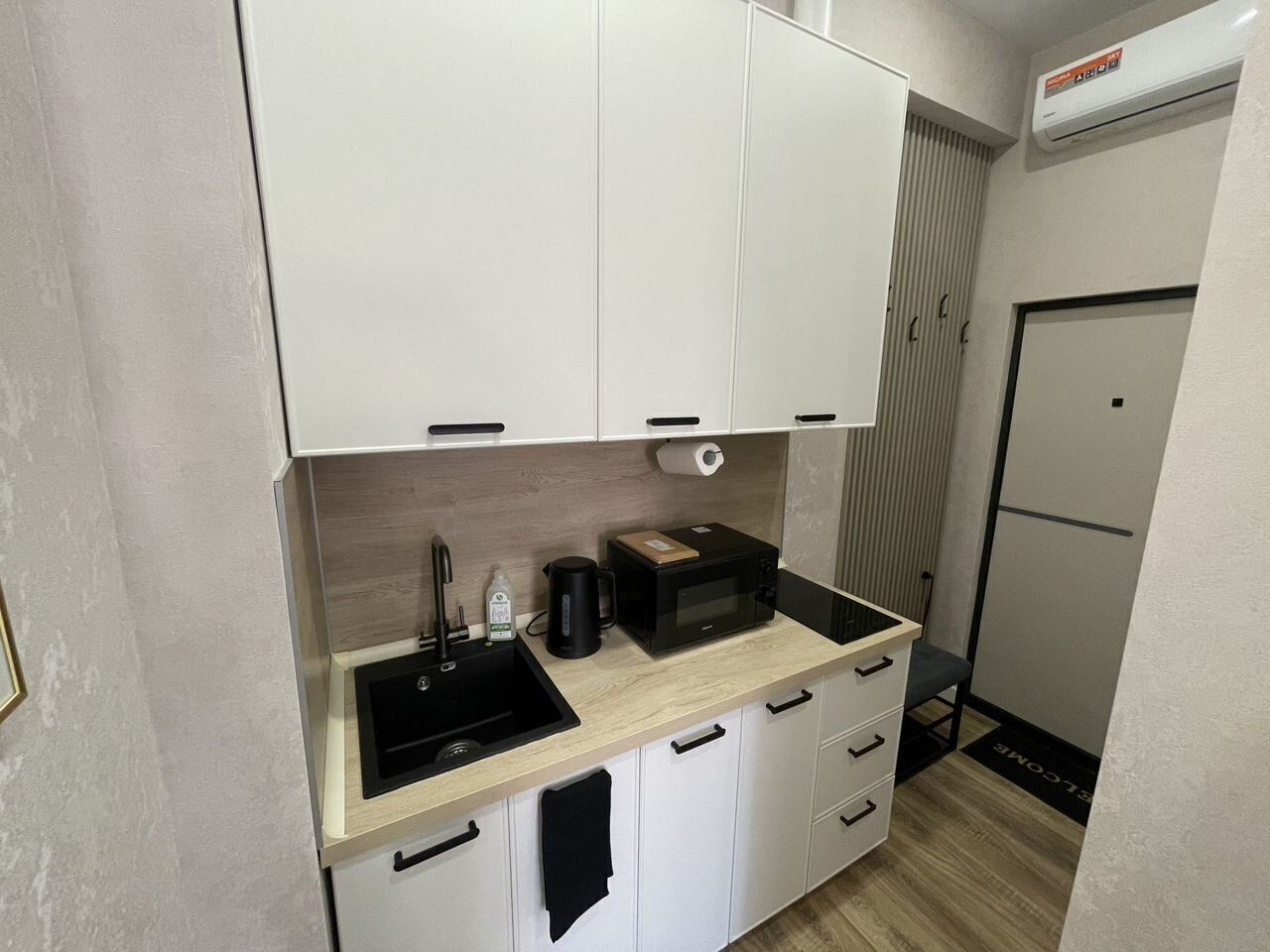 Кухонная зона, состоит из барного обеденного стола, микроволновая печь, варочная панель, мини-холодильник с морозильной камерой, полный комплект кухонной утвари для готовки, полный комплект посуды на 2-ух гостей (см, фото), моющее средство для посуды.