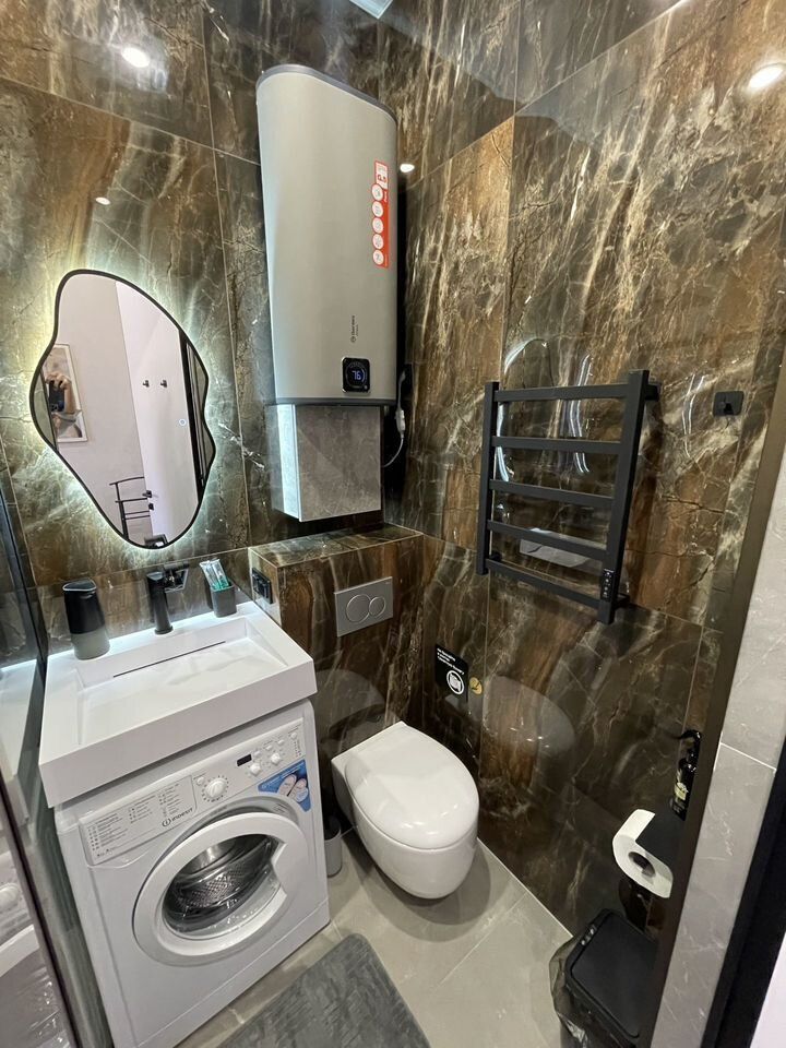 Ванная комната: душевая кабина с тропическим душем и 4-мя видами леек, стиральная машинка с гелем для стирки, большой водонагреватель; фен, полный комплект полотенец (банное, для рук, для ног), необходимые жидкости (крем-мыло для рук, гель для душа, шампунь).